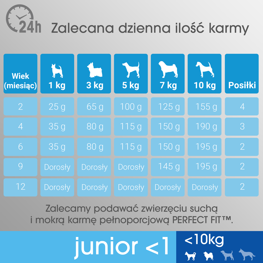 Z recepturą Perfect Fit dostarczasz niezbędne składniki odżywcze i energię we właściwych ilościach – mały pupil rozwinie optymalną masę i kondycję ciała.
