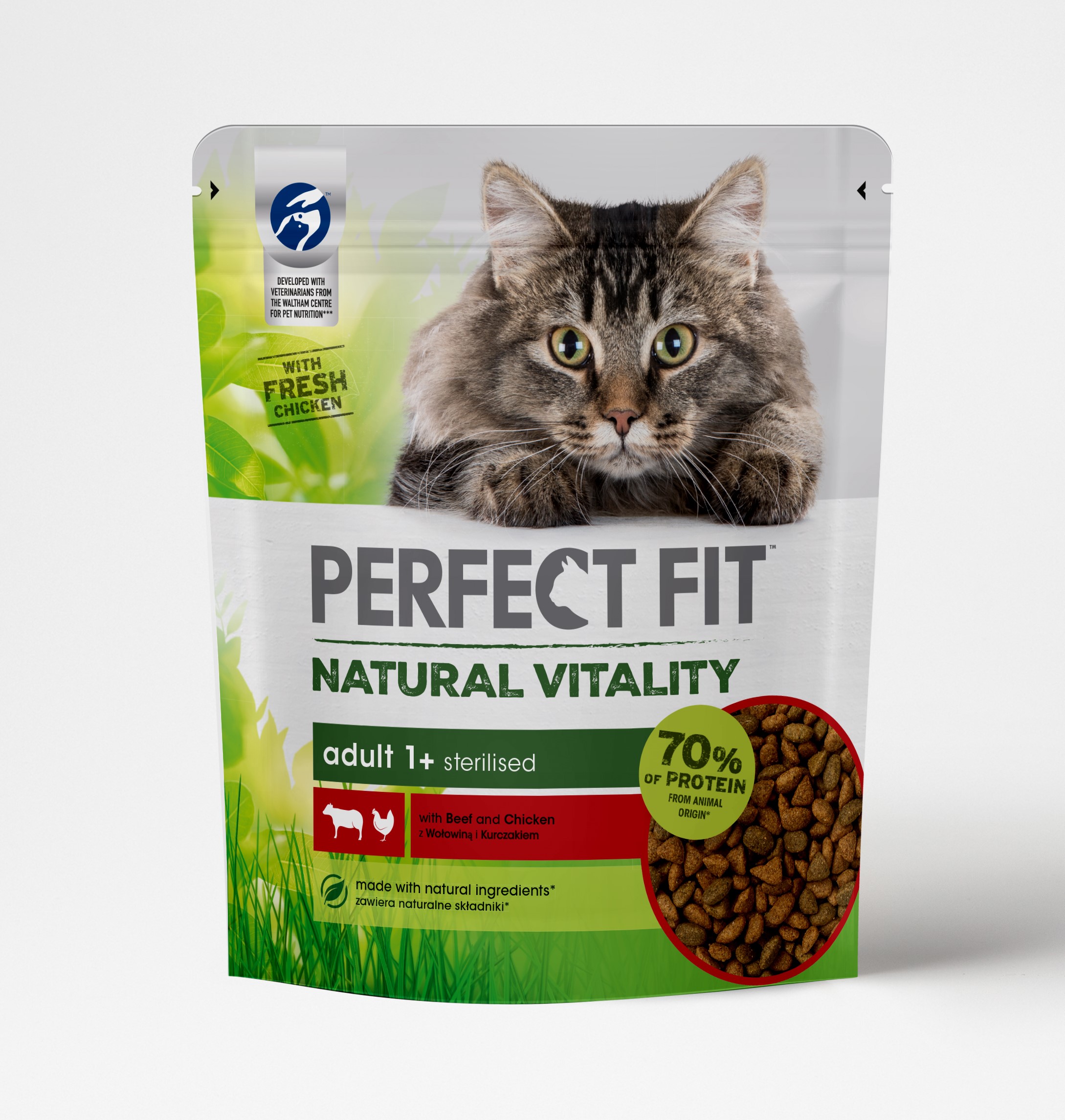 Karma dla dorosłego kota (powyżej 1 roku życia) po sterylizacji bogata w składniki odżywcze, niezbędne każdego dnia. Zgodnie z wymaganiami żywieniowymi bezwzględnych mięsożerców, jakimi są koty, karma dla kota PERFECT FIT Natural Vitality z Wołowiną i Kurczakiem charakteryzuje się dużą zawartością białka pochodzenia zwierzęcego. Wspomaga ono rozwój silnych mięśni i zapewnia aminokwasy niezbędne do zdrowego życia. Obecność wołowiny oraz świeżego kurczaka w tym jedzeniu dla kota zapewnia różnorodność, którą koty tak lubią. Tę karmę cechuje także wysoka zawartość składników naturalnego pochodzenia zaspokajających potrzeby żywieniowe pupila wpisane w jego naturę. PERFECT FIT Natural Vitality z Wołowiną i Kurczakiem zapewnia kotu odżywianie, jakiego potrzebuje oraz wyjątkowy smak.
