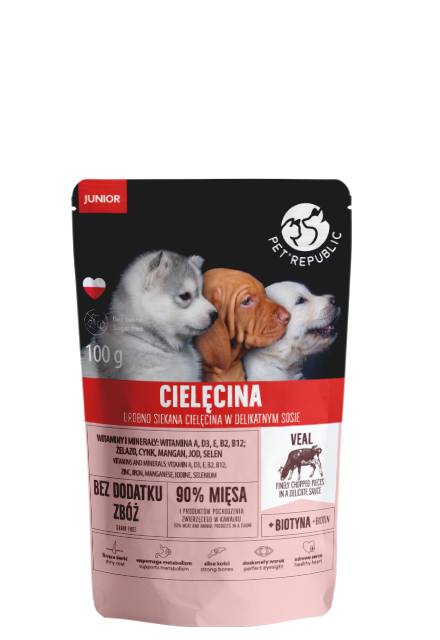 Drobno siekane kawałki cielęciny dla psów wszystkich ras, serwowane w delikatnym sosie stanowiącym zaproszenie do pysznego posiłku. 90% mięsa i produktów pochodzenia zwierzęcego w kawałku!