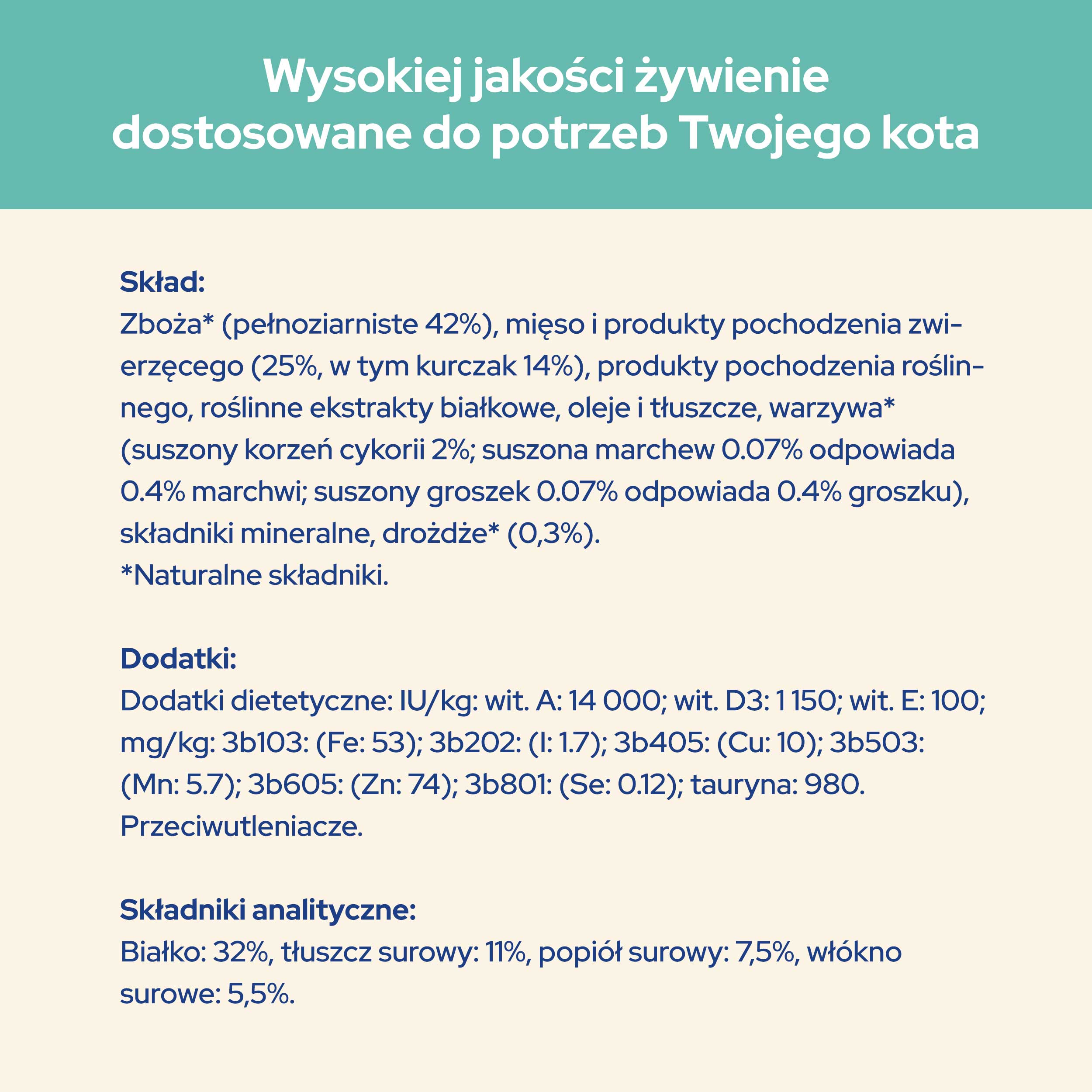 Bogata w kurczaka oraz źródła białka specjalnie wybrane ze względu na ich jakość, aby zaspokoić naturalne potrzeby kotów.