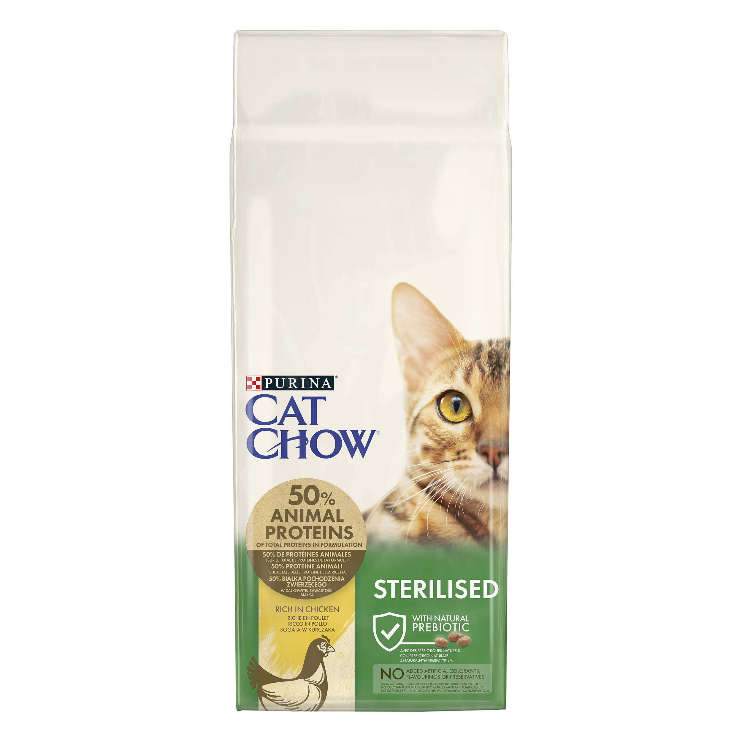 Purina Cat Chow Special Care Sterilised została specjalnie opracowana, aby pomóc równoważyć wpływ zmian hormonalnych związanych z zabiegiem sterylizacji. Zbilansowany poziom białka i tłuszczu w karmie pomaga zachować silne mięśnie oraz utrzymać prawidłową wagę dorosłego kota. Karma bogata jest w kurczaka oraz zawiera wszystkie składniki odżywcze niezbędne do zachowania zdrowia kotów po sterylizacji lub kastracji.