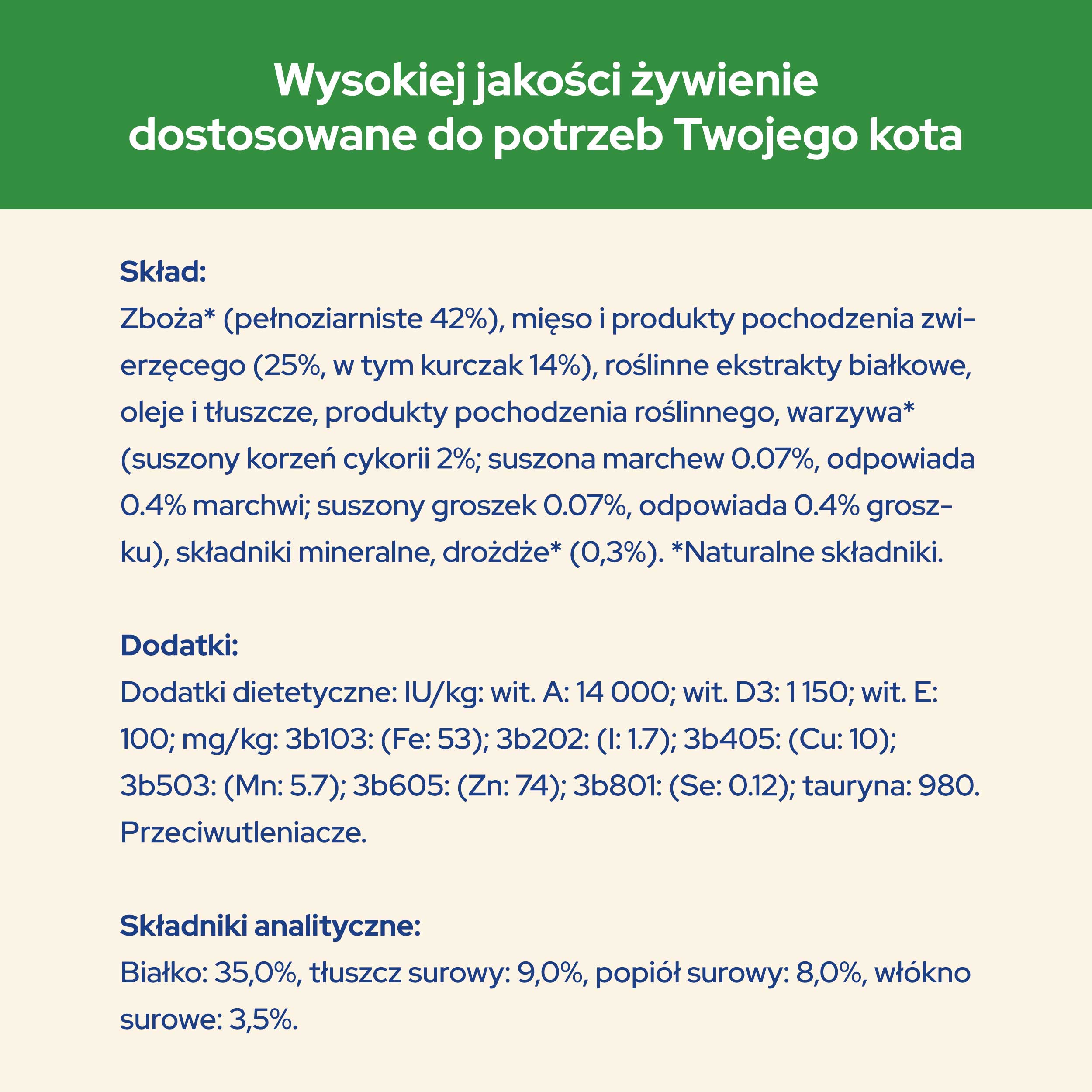 Bogata w kurczaka oraz źródła białka specjalnie wybrane ze względu na ich jakość, aby zaspokoić naturalne potrzeby kotów.