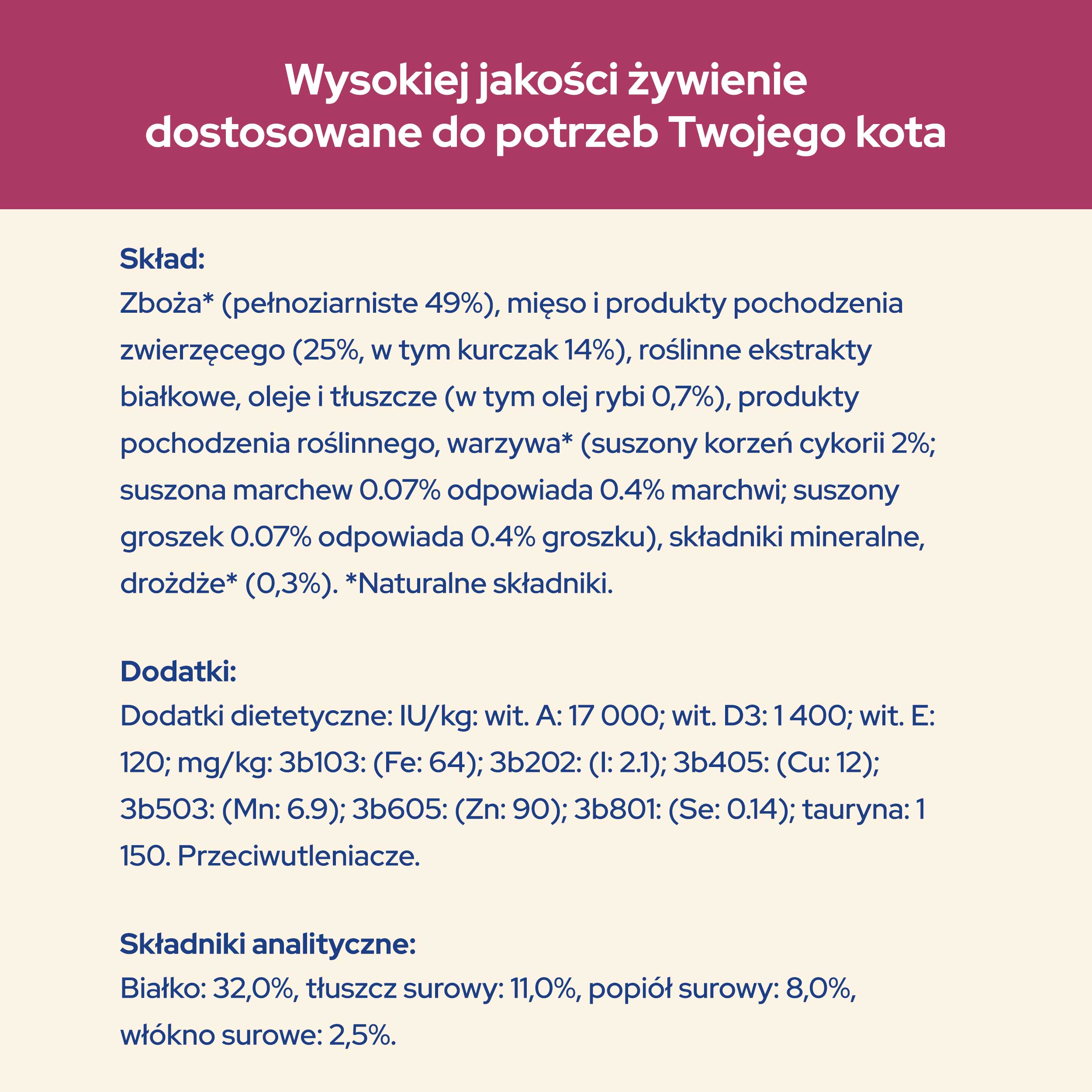 Bogata w kurczaka oraz źródła białka specjalnie wybrane ze względu na ich jakość, aby zaspokoić naturalne potrzeby kotów.