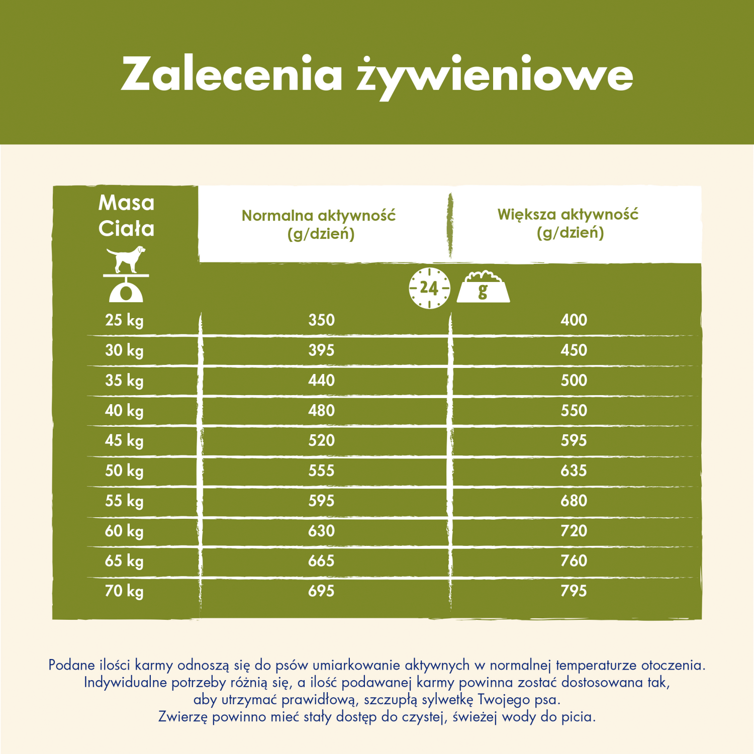 Dostosuj ilość karmy w zależności od poziomu aktywności, kondycji fizycznej i indywidualnych potrzeb Twojego psa.