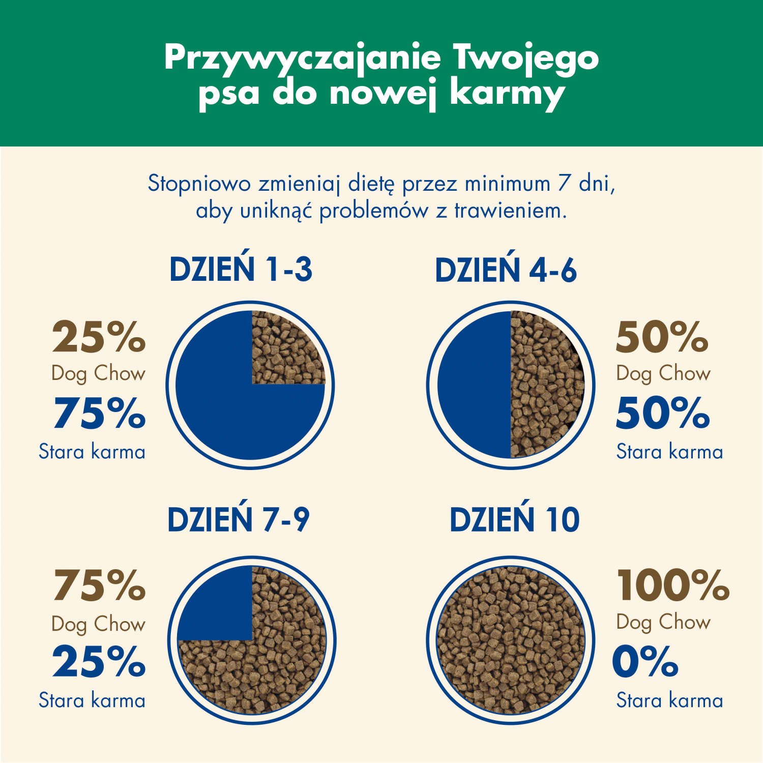 W celu kontrolowania stanu zdrowia Twojego psa, konsultuj się regularnie z lekarzem weterynarii. Wprowadzaj karmę PURINA DOG CHOW stopniowo przez 7 dni.