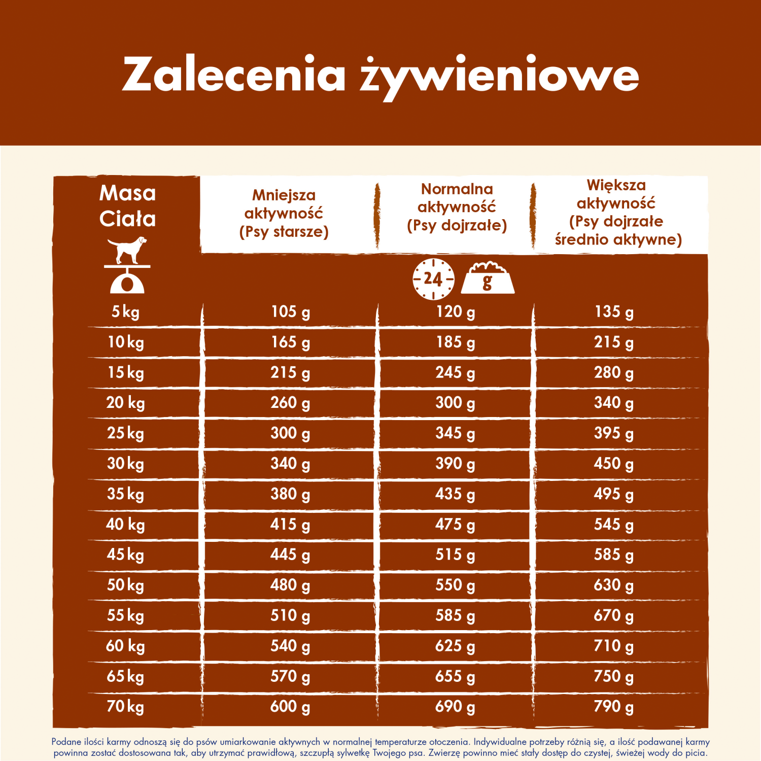 | Skład | Zboża (53% pełnoziarniste), mięso i produkty pochodzenia zwierzęcego (20%, w tym jagnięcina 4%), roślinne ekstrakty białkowe, produkty pochodzenia roślinnego, oleje i tłuszcze, warzywa (suszona cykoria 1.1%, suszony groch 0.08%, suszona marchew 0.08%), minerały. |