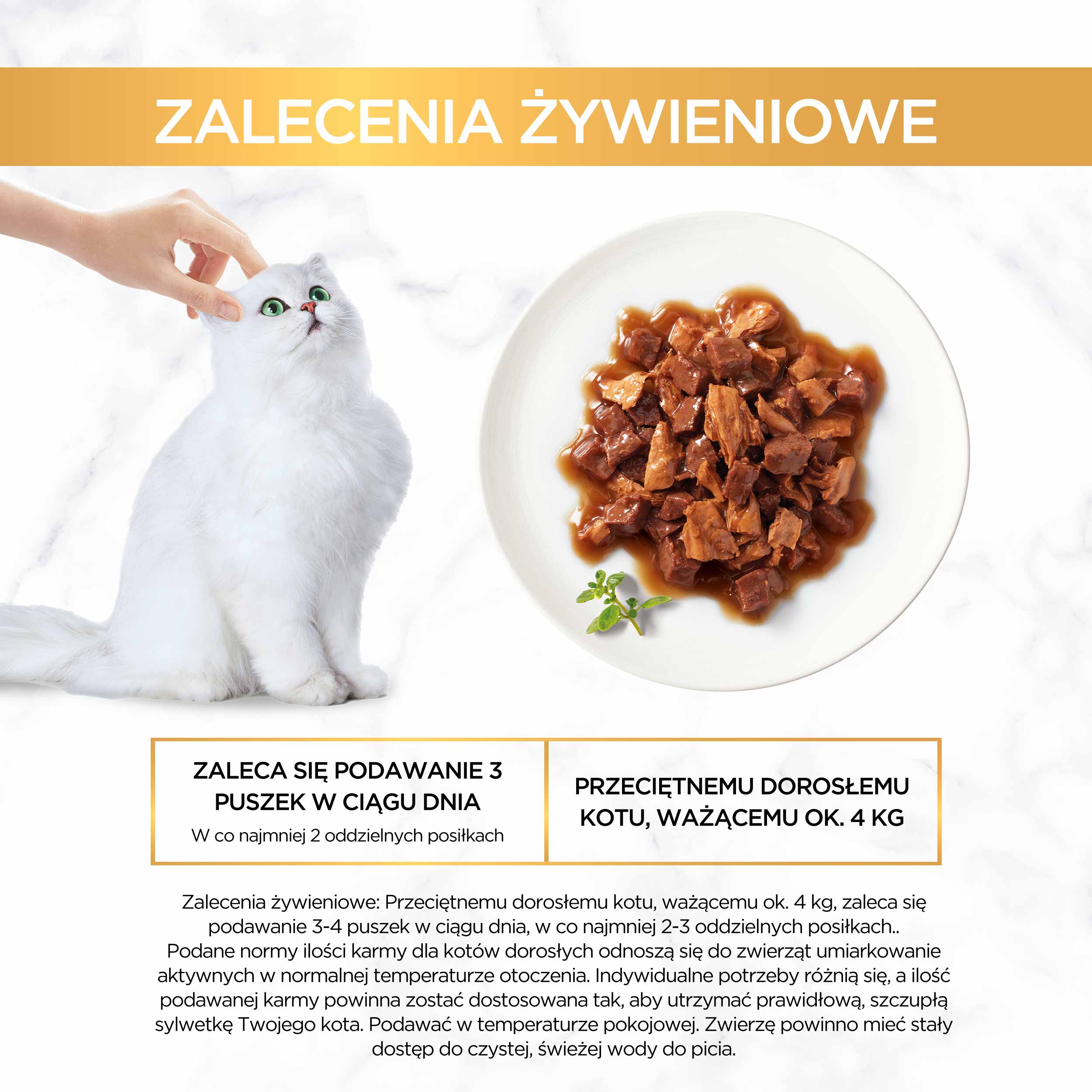 Dorosłemu kotu ważącemu ok. 4kg zaleca się podawać do 4 puszek dziennie w postaci co najmniej 2 posiłków.