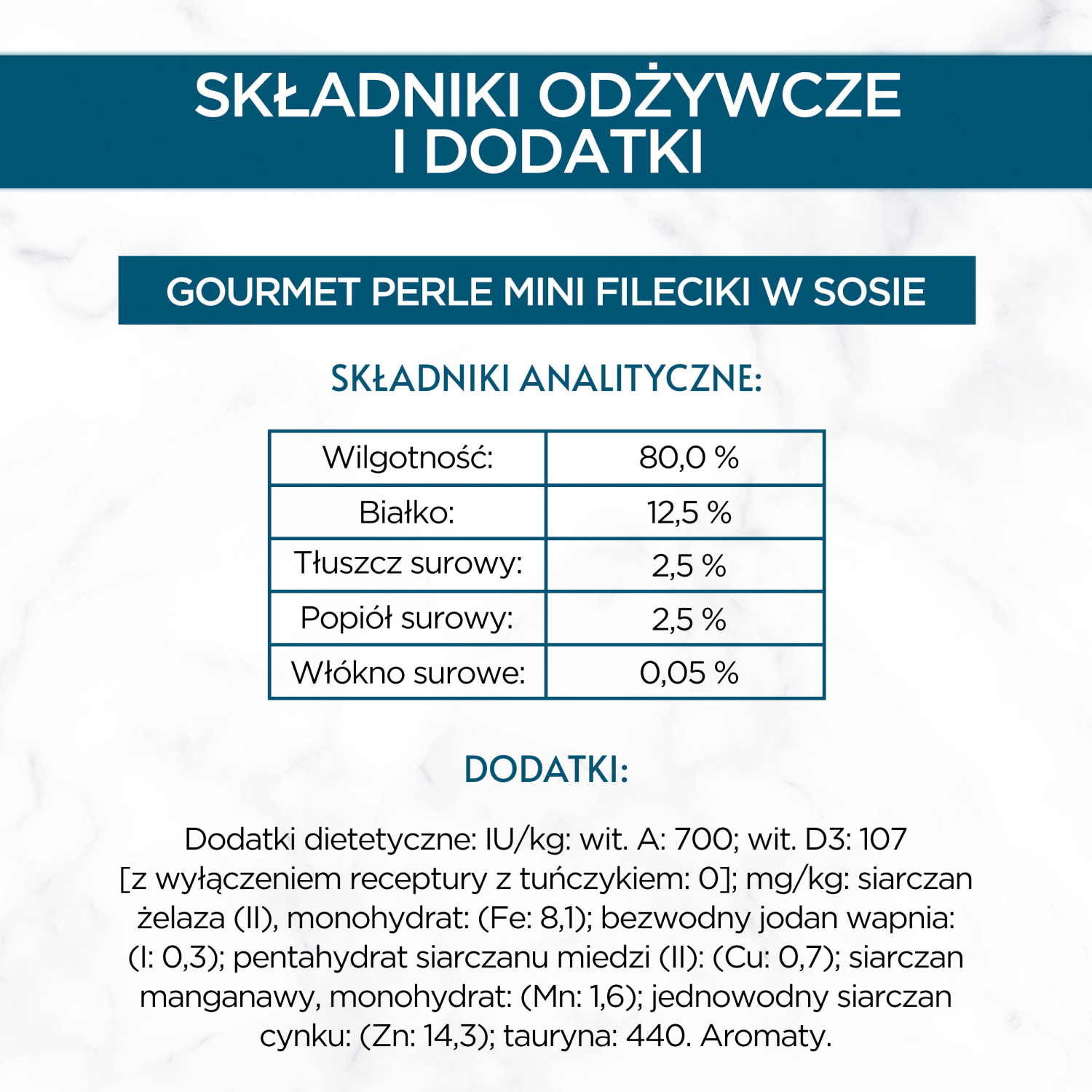 witamina A 700 j.m., witamina D₃ 105 j.m. (z wyjątkiem receptury z tuńczykiem – 0), żelazo (Fe) 8 mg, jod (I) 0,2 mg, miedź (Cu) 0,7 mg, mangan (Mn) 1,5 mg, cynk (Zn) 14,5 mg, tauryna 440 mg