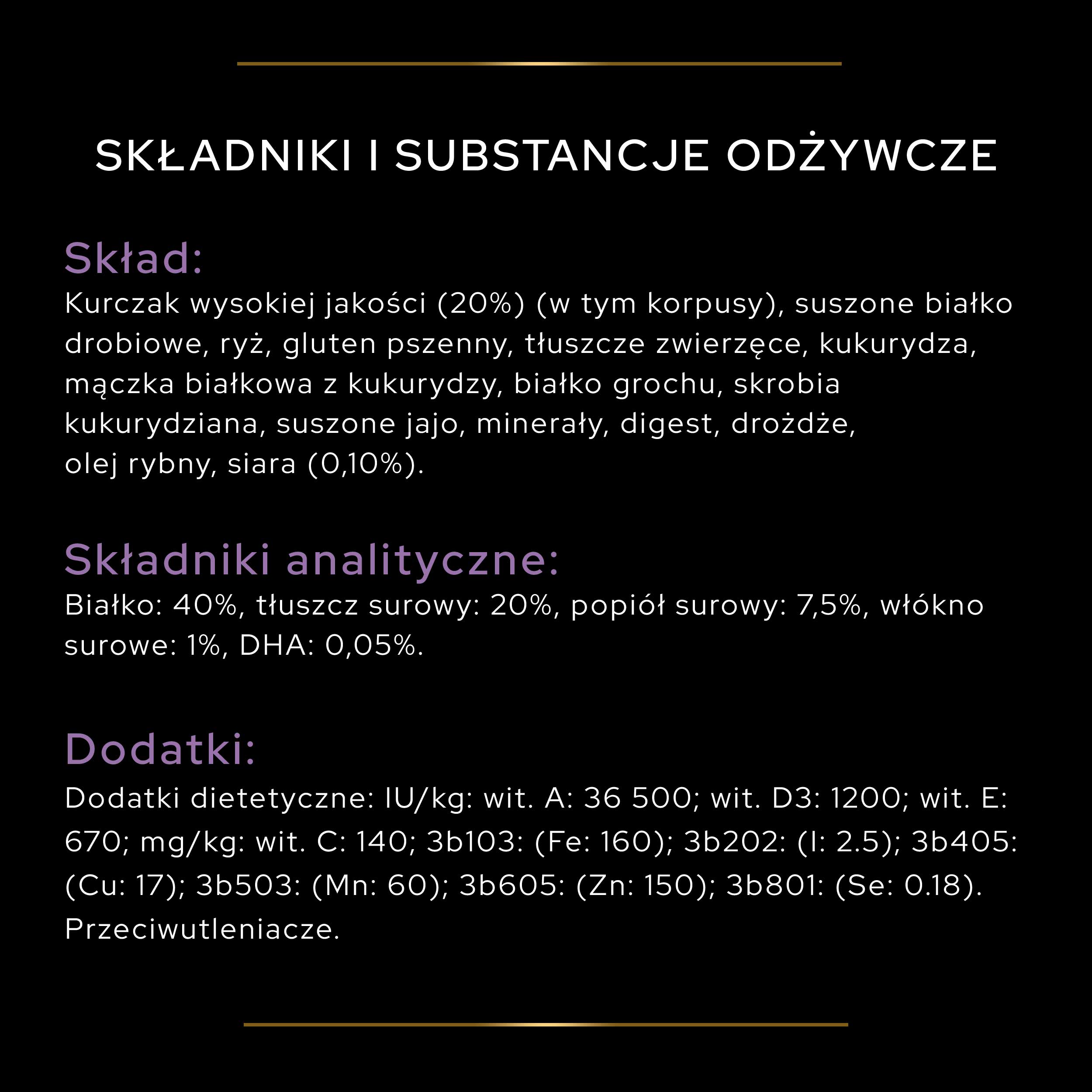 Pro Plan Original Kitten, kurczak to zbilansowana karma dla kociąt (1 do 12 miesięcy) oraz dla karmiących i ciężarnych kotek. W pierwszym roku życia u kocięcia rozwijają się naturalne systemy ochronne, które będą chronić jego zdrowie przez całe życie. Układ odpornościowy jest fundamentem tych systemów. Twoje kocię „buduje” skomplikowany system ochronny, który chroni całe ciało. Zapewnia ochronę układu pokarmowego, skóry i sierści oraz układu moczowego. Aby się tak dobrze rozwinąć w pierwszym roku życia, młody kot potrzebuje zbilansowanej ilości składników odżywczych, zestawionych w specjalny sposób, aby wspierać najważniejsze systemy ochronne organizmu. Dlatego Pro Plan Original Kitten, kurczak zapewnia kociętom wszystkie niezbędne do życia składniki odżywcze, aby Twój ulubieniec mógł się prawidłowo rozwijać i cieszyć się długim i zdrowym życiem. Karma o smaku kurczaka z ryżem.