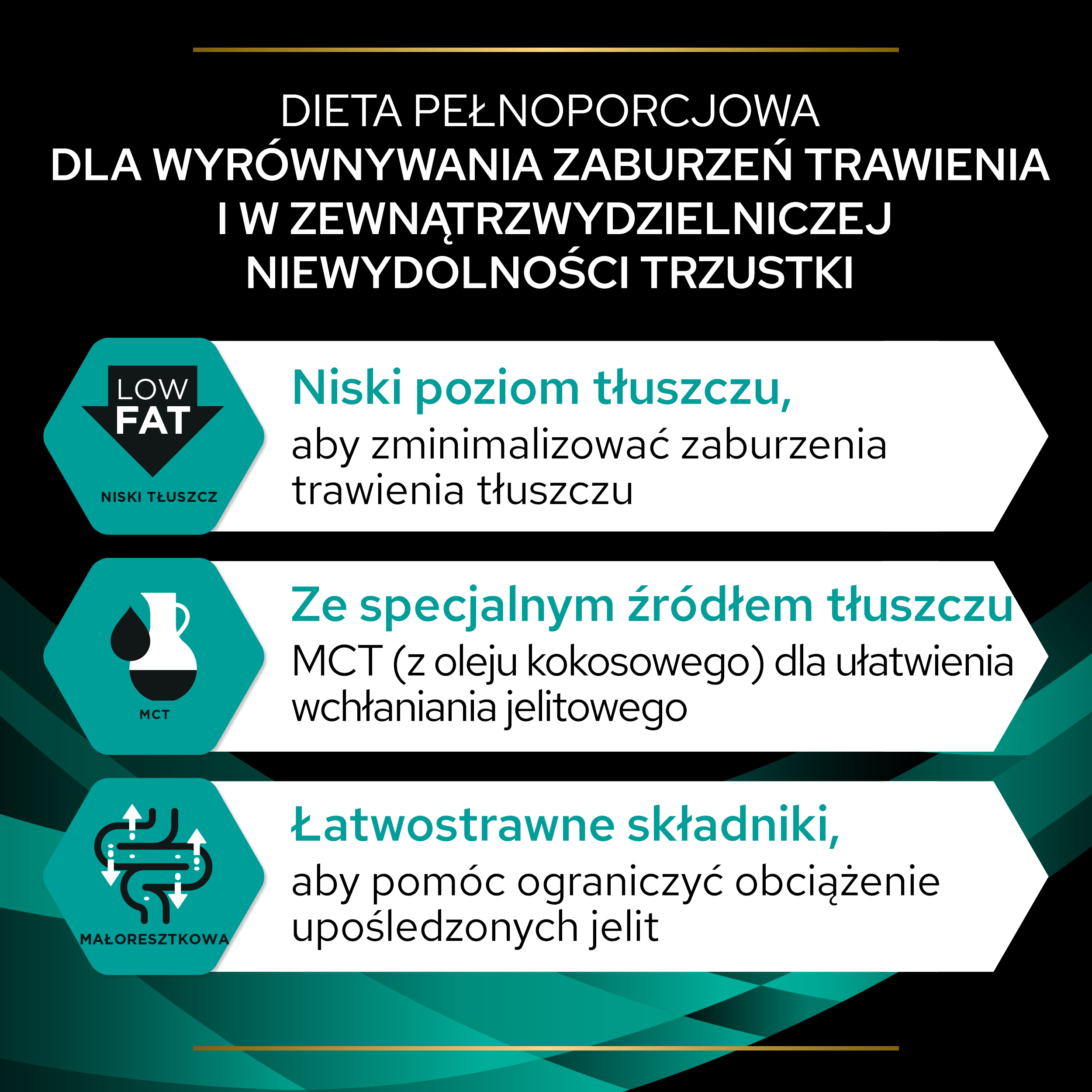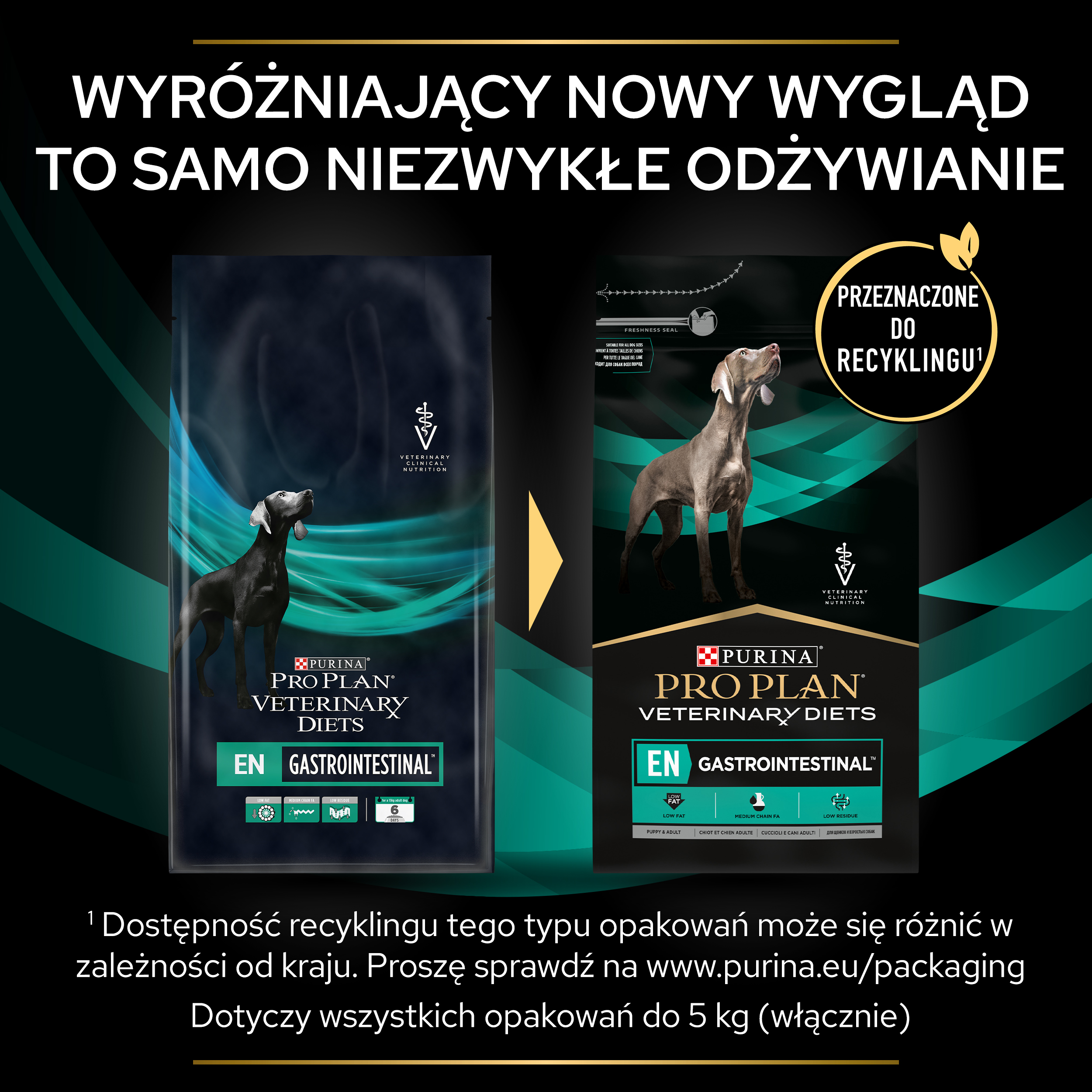 PURINA Veterinary Diets EN Gastrointestinal to karma dietetyczna dla psów, przeznaczona do podawania w przebiegu chorób prowadzących do zaburzenia trawienia oraz przy zewnątrzwydzielniczej niewydolności trzustki, zawierająca w swym składzie wysoce strawne składniki oraz zmniejszoną ilość tłuszczu.