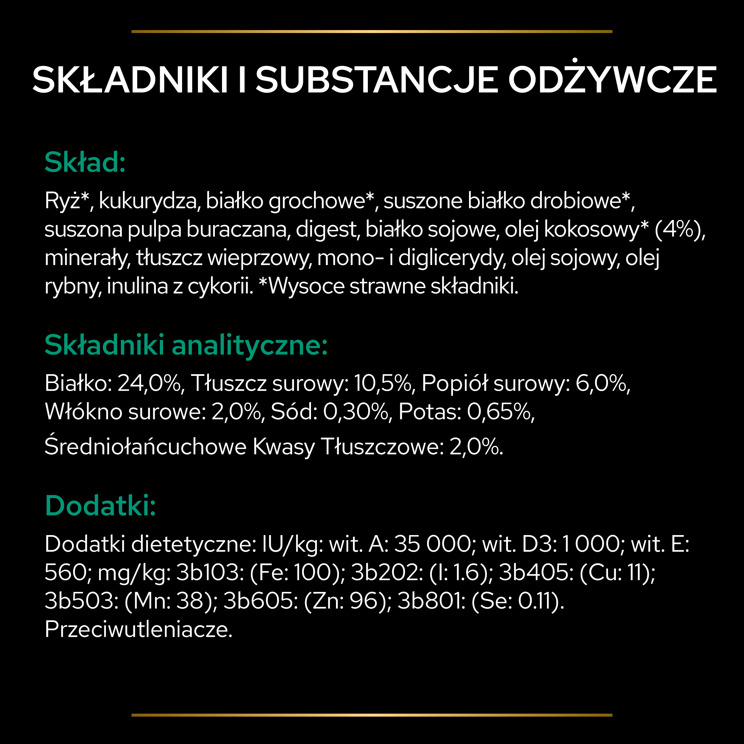 Źródło średnio łańcuchowych kwasów tłuszczowych (20-26% tłuszczu w suchej karmie, 14-19% tłuszczu w mokrej karmie) – Zapewnia wysoce przyswajalne źródło energii.
