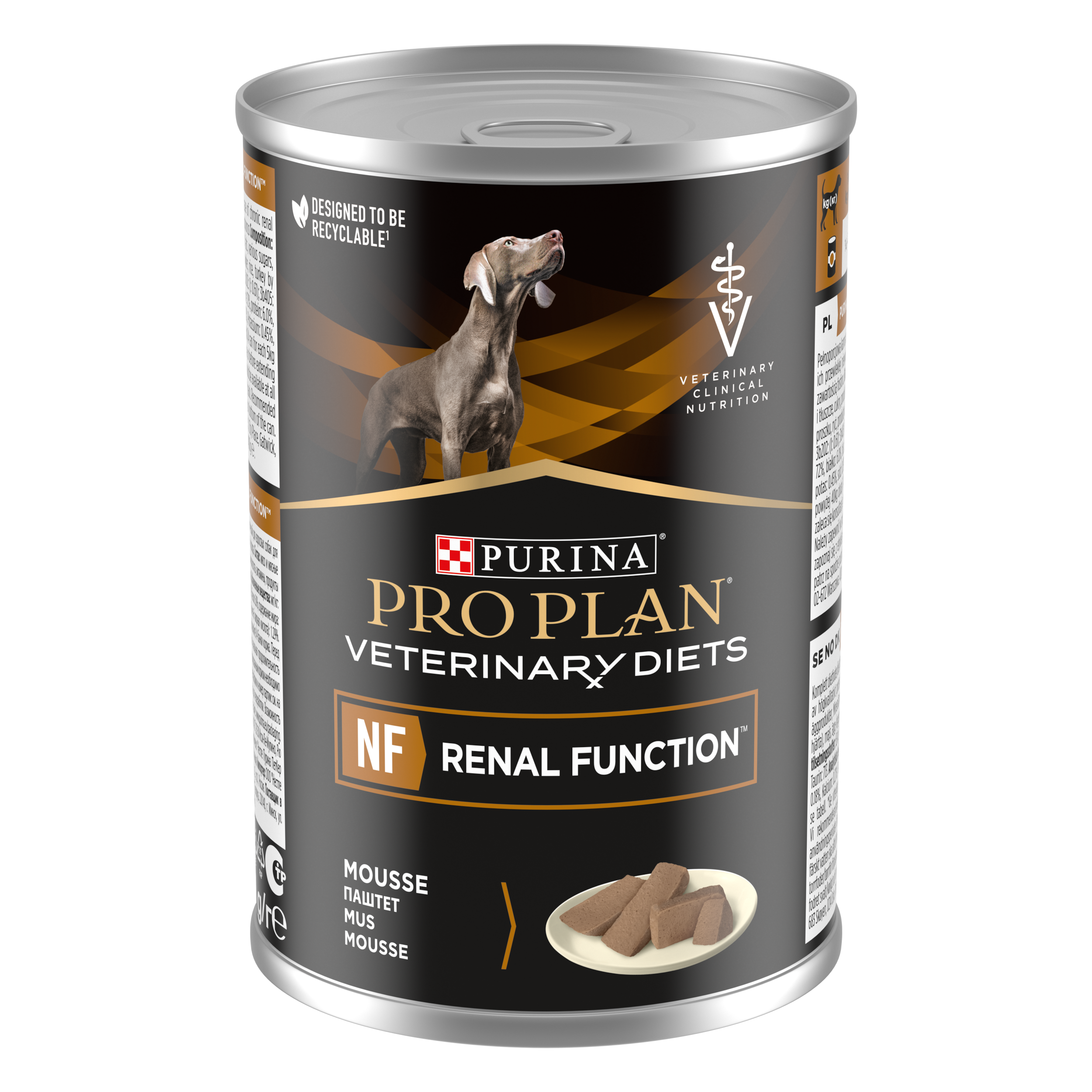 PURINA Veterinary Diets NF Renal Function to karma dietetyczna dla psów, o niskiej zawartości fosforu oraz o ograniczonej ilości białka ale o wysokiej jakości, przeznaczona do wspomagania funkcji nerek w przypadkach przewlekłej niewydolności nerek. Stanowi kompletną, zbilansowaną karmę dla dorosłych psów.