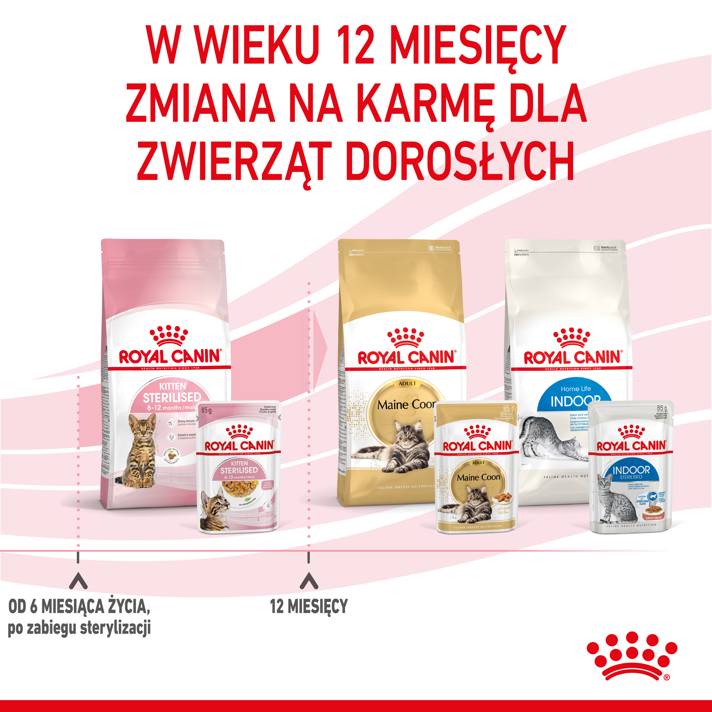 Twoje kociątko to jeszcze nie kot – Kocięta, podobnie jak małe dzieci, mają szczególne potrzeby żywieniowe. Karma mokra ROYAL CANIN Kitten Sterilised została opracowana dla kociąt między 6 a 12 miesiącem życia, sterylizowanych. Karma ROYAL CANIN Kitten Sterilised w galaretce charakteryzuje się optymalnym profilem składników pokarmowych, dlatego jest instynktownie wybierana przez kocięta. Umiarkowany poziom energii w karmie ROYAL CANIN Kitten Sterilised w galaretce sprzyja utrzymaniu prawidłowej masy ciała u sterylizowanych kociąt.
