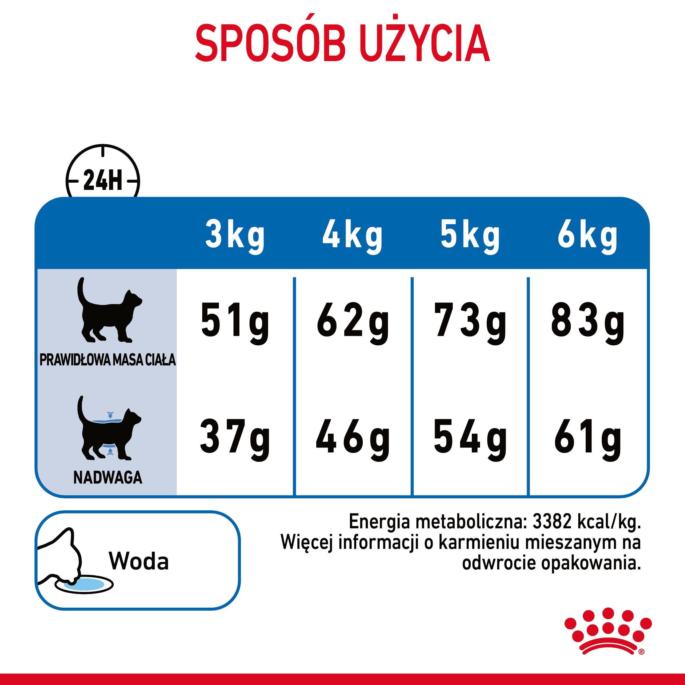 Utrzymanie idealnej kondycji ciała i masy mięśniowej jest kluczowym aspektem ogólnego stanu zdrowia Twojego kota. ROYAL CANIN Light Weight Care to precyzyjnie zbilansowana formuła żywieniowa, która pomaga Twojemu kotu utrzymać zdrową kondycję ciała. Zawiera specjalną mieszankę włókien (w tym psyllium), które zwiększają objętość pokarmu w żołądku, wspomagając uczucie sytości, co w naturalny sposób ogranicza spontaniczne podjadanie. Karma dla kotów mających tendencję do tycia, w wieku od 1 do 7 roku życia.
