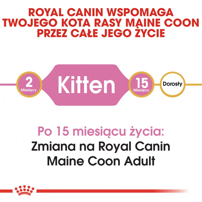 ROYAL CANIN Maine Coon Kitten to karma opracowana specjalnie dla kociąt rasy maine coon. Odpowiednio dostosowana dieta dba o prawidłowy rozwój kocięcia przez cały okres wzrostu do 15 miesiąca życia. Układ pokarmowy kocięcia cały czas się rozwija. Dla prawidłowego przebiegu trawienia ważne są białka wysokiej jakości. Karma ROYAL CANIN Maine Coon Kitten zawiera wysoko strawne białka L.I.P. oraz prebiotyki sprzyjające równowadze flory bakteryjnej jelit. Układ immunologiczny rozwija się przez cały okres wzrostu.