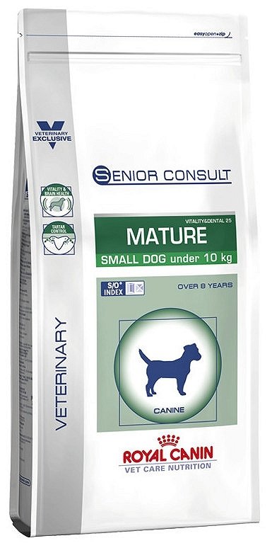 Pełnoporcjowa dietetyczna karma dla starszych psów powyżej 8 roku życia, ras do 10 kg. ROYAL CANIN MATURE CONSULT SMALL DOG karma sucha, to pełnoporcjowa dietetyczna karma dla psów, wspomagająca funkcję skóry w przypadku dermatoz lub nadmiernego wypadania sierści, dzięki wysokiemu poziomowi kwasu linolowego (LA) oraz wysokiej ogólnej zawartości kwasu eikozapentaenowego (EPA) i kwasu dokozaheksaenowego (DHA).