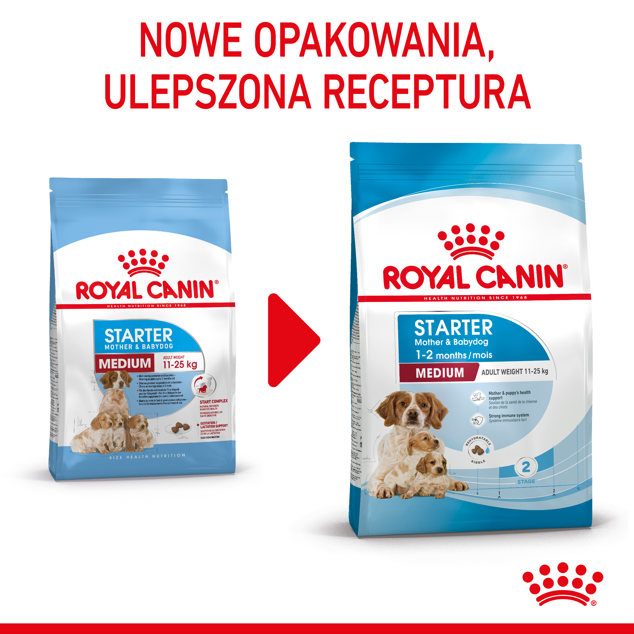 Zarówno suka w ciąży, jak i nowo narodzone szczenięta, wymagają odpowiednio dobranej karmy, sprzyjającej zdrowiu suki oraz zapewniającej szczeniętom jak najlepszy start. ROYAL CANIN Medium Starter Mother & Babydog to karma przeznaczona zarówno dla suk, jak i szczeniąt ras średnich, o masie ciała od 11 do 25 kg. Unikalny „Start Complex” czyli kompleks składników pokarmowych naturalnie występujących w mleku matki, wzbogacony o substancje chroniące wrażliwy układ pokarmowy szczeniąt wspiera ten newralgiczny okres w życiu szczenięcia. Tekstura krokietów dostosowana jest do potrzeb szczeniąt w okresie przechodzenia z pokarmu płynnego (mleko matki) na stały (do 2 miesiąca życia). Krokiety o wysokiej smakowitości, łatwo ulegają namoczeniu do konsystencji delikatnej papki. Karma ROYAL CANIN Medium Starter Mother & Babydog pokrywa potrzeby energetyczne suki od 42 dnia ciąży oraz w czasie laktacji.