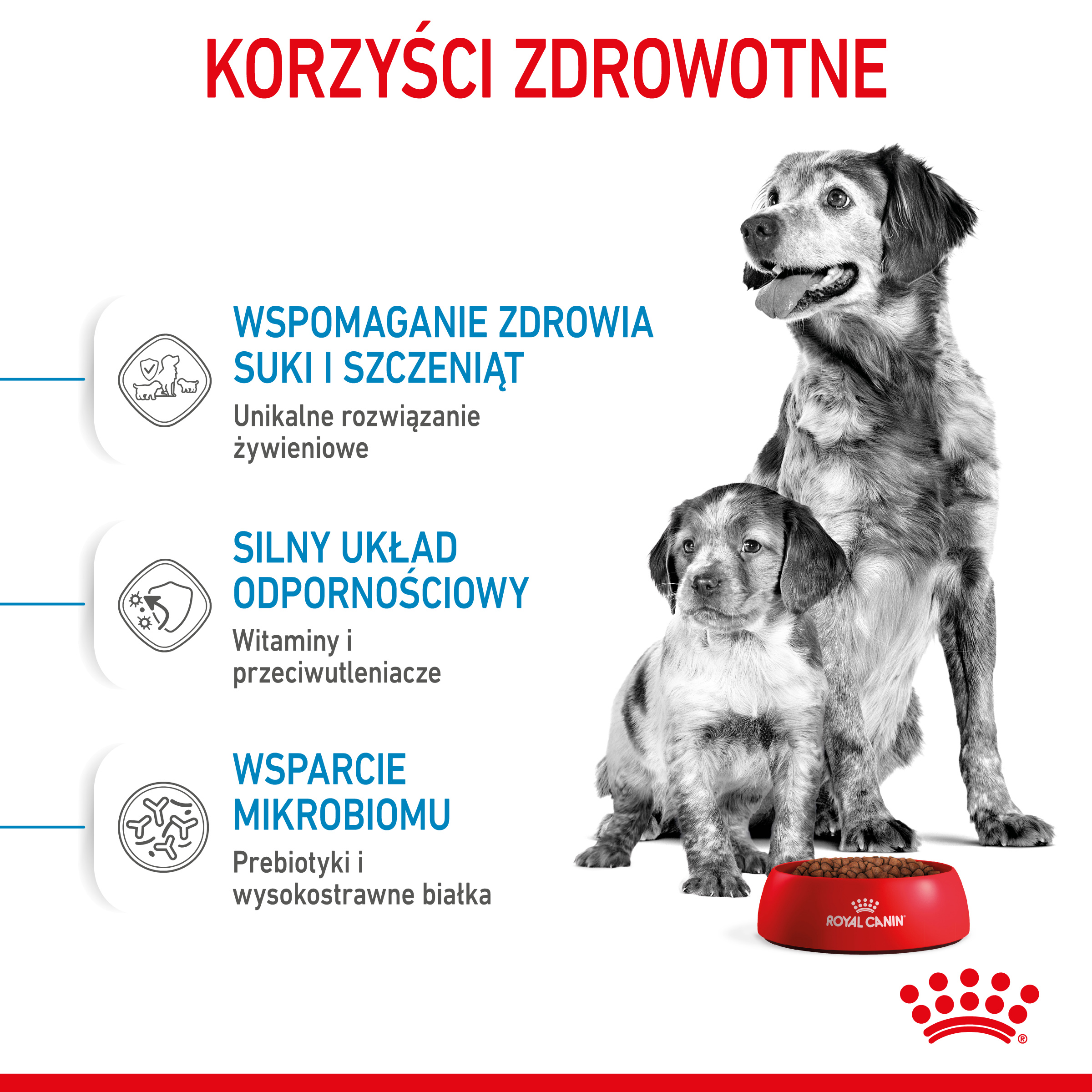 Receptura karmy jest dostosowana do zwiększonych potrzeb pokarmowych suk w ostatnim etapie ciąży oraz w laktacji.