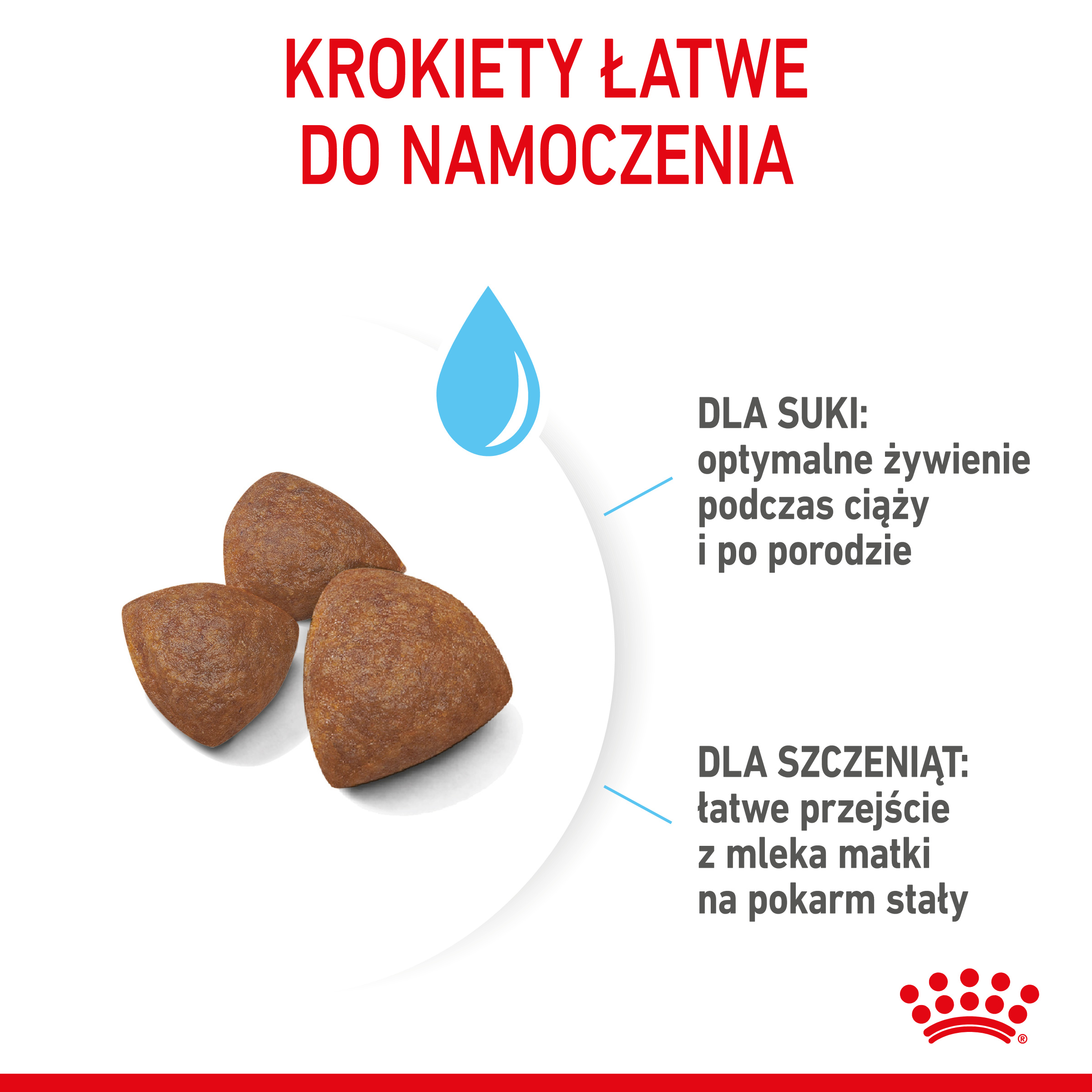 Krokiety o wysokiej smakowitości dla suk oraz dla szczeniąt w okresie odsadzania łatwo ulegają namoczeniu do delikatnej konsystencji papki i ułatwiają przejście z mleka matki na stały pokarm.