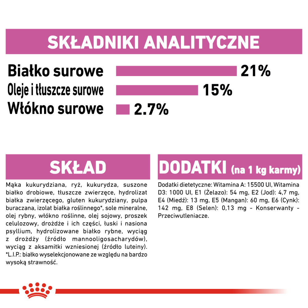 Wszystkie karmy Royal Canin są pełnoporcjowe, co oznacza, że w 100% pokrywają zapotrzebowanie organizmu na wysokiej jakości białka, tłuszcze, włókno, witaminy i składniki mineralne, potrzebne dla zdrowia i dobrego samopoczucia twojego psa.