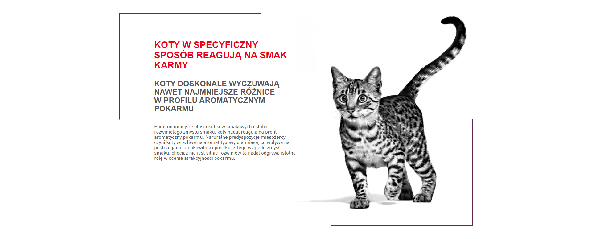 ROYAL CANIN Sensory taste kawałki w sosie to pełnoporcjowa karma mokra dla dorosłych kotów, została opracowana specjalnie, aby stymulować zmysł smaku Twojego kota, jednocześnie wspierając optymalne zdrowie i dobre samopoczucie. Pomimo mniejszej ilości kubków smakowych i słabo rozwiniętego zmysłu smaku, koty nadal reagują na profil smakowy pokarmu. Formuła karmy została opracowana tak, aby dopasować optymalny profil makroskładników, co odpowiada naturalnym preferencjom kotów dorosłych.