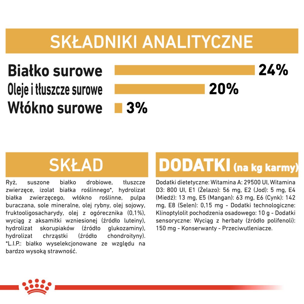 ROYAL CANIN Shih Tzu Adult przeznaczona jest dla psów ras małych i miniaturowych, dedykowana rasie shih tzu w wieku powyżej 10 miesięcy. ROYAL CANIN Shih Tzu Adult zawiera zawiera kwasy tłuszczowe omega-3 – EPA i DHA, a także olej z ogórecznika, które sprzyjają wzmocnieniu bariery skórnej oraz zachowaniu pięknej sierści. Receptura karmy sprzyja także ograniczaniu powstawania kamienia nazębnego dzięki związkom wiążącym wapń. Krokiety karmy ROYAL CANIN Shih Tzu Adult zostały precyzyjnie dostosowane do brachycefalicznej budowy czaszki rasy shit tzu, co ułatwia chwytanie i rozgryzanie karmy.