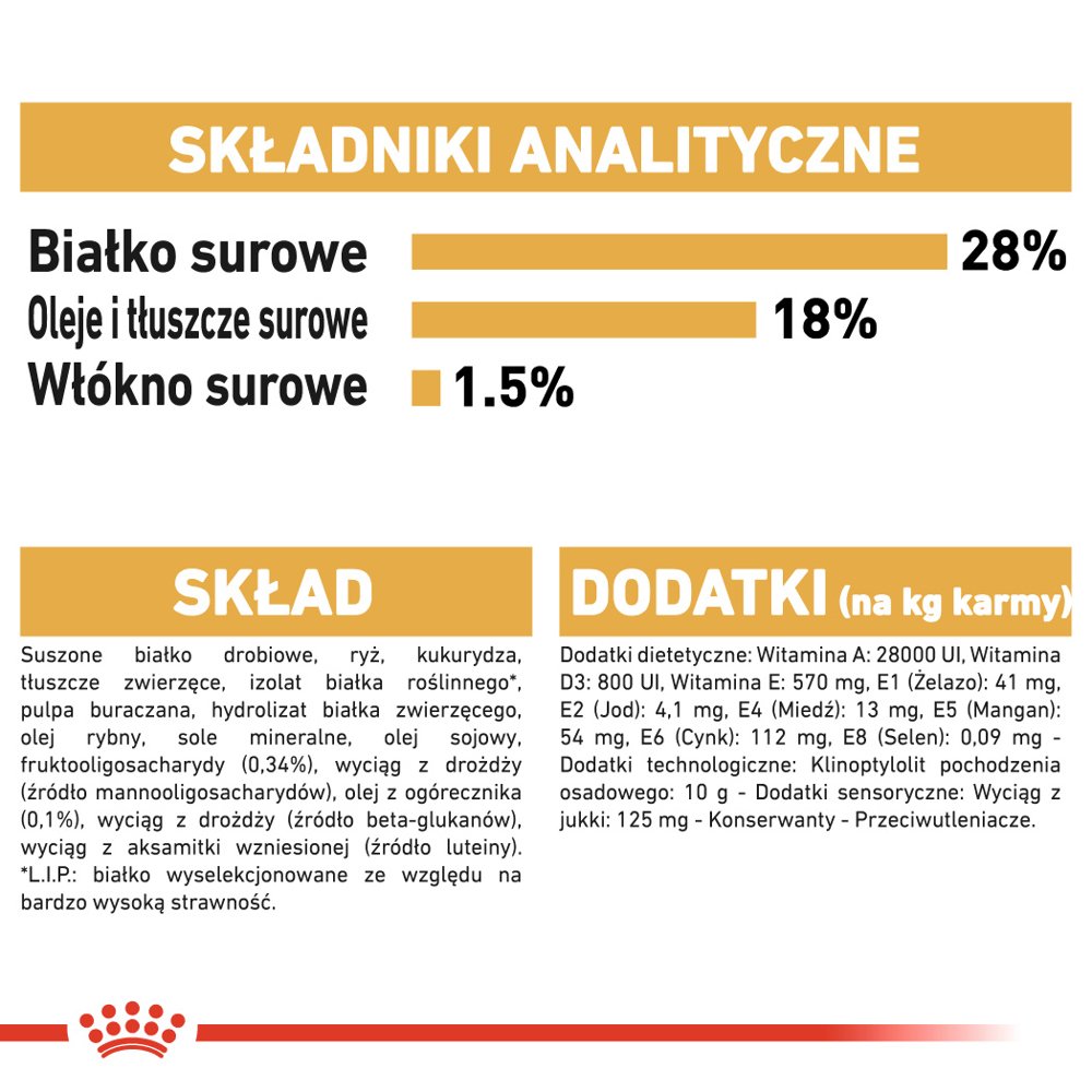 Kombinacja składników pokarmowych: wysokiej jakości białka (L.I.P.) oraz prebiotyków (FOS) wspomaga zdrowie przewodu pokarmowego oraz równowagę flory bakteryjnej jelit, co zapewnia odpowiednią jakość kału.