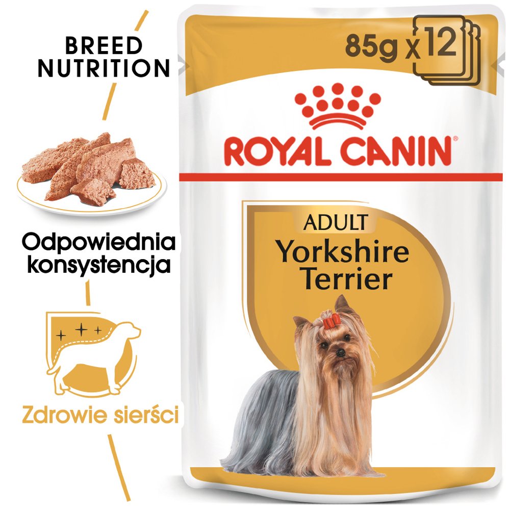 Karma mokra ROYAL CANIN Yorkshire Terrier Adult została opracowana specjalnie dla psów, powyżej 10 miesiąca życia, ras małych i miniaturowych dedykowana rasie yorkshire terier. Karma ROYAL CANIN Yorkshire Terrier pomaga sprzyja zdrowiu skóry oraz wpływa na stan okrywy włosowej. Unikalna kompozycja składników pokarmowych sprzyja utrzymaniu lśniącej i pięknej sierści.