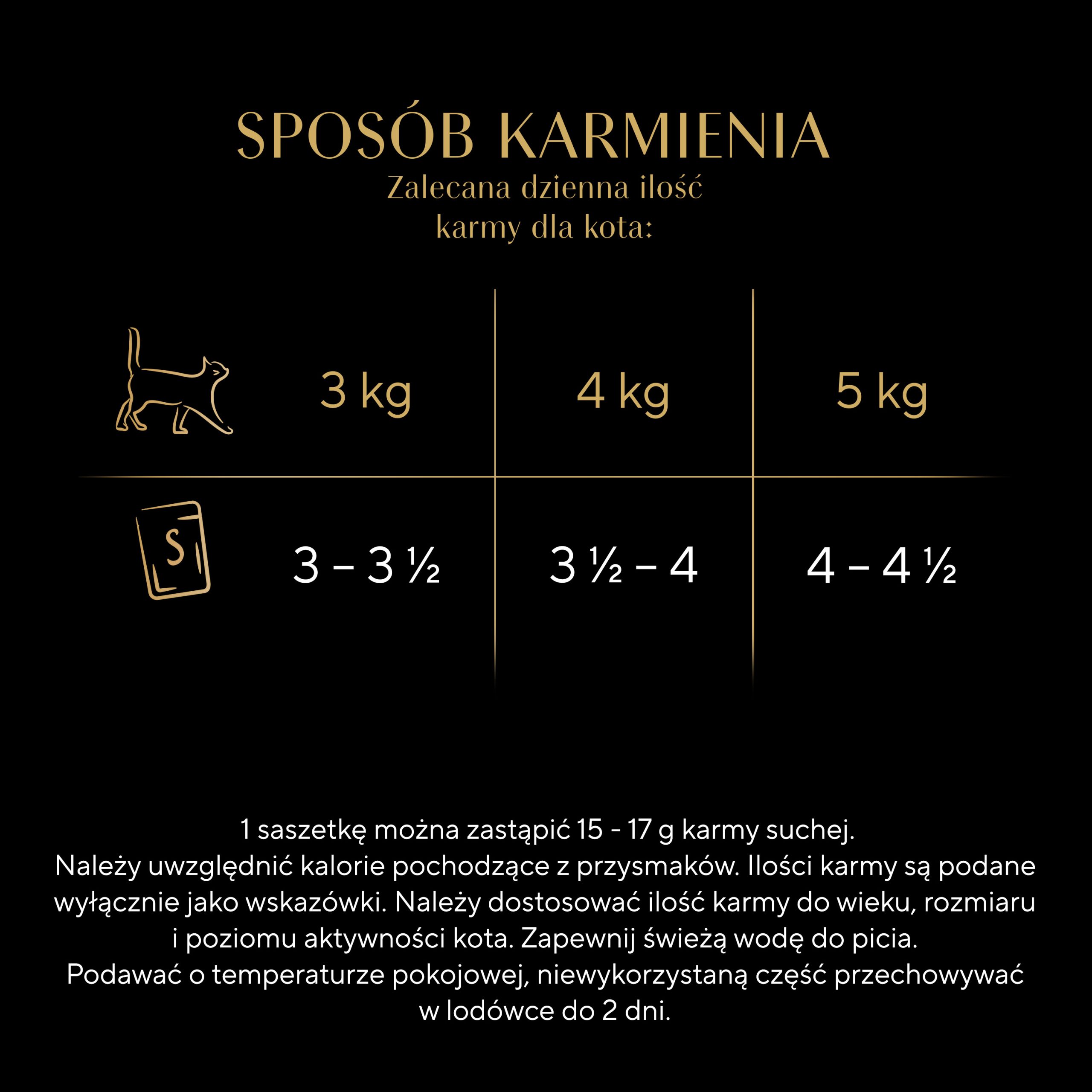 Kot o wadze 5 kg potrzebuje 3,5 saszetki karmy mokrej dziennie lub 2,5 saszetki karmy mokrej i 20 g karmy suchej dziennie.