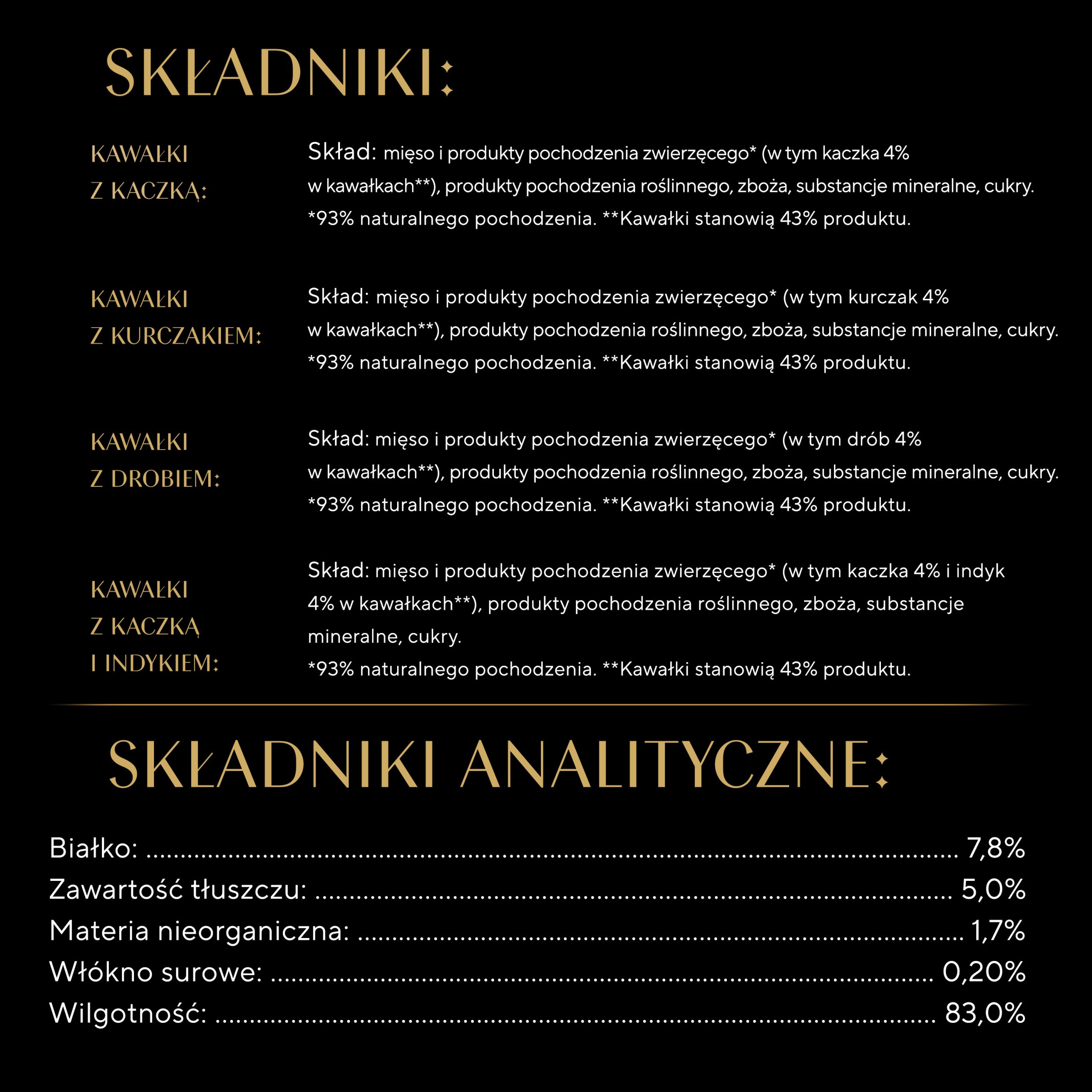 Cztery warianty smakowe: kaczka, kurczak, drób, kaczka z indykiem.