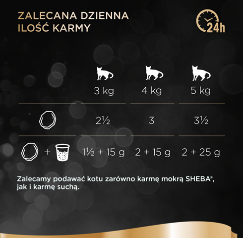 Kot (3 kg) potrzebuje 2 i 1/2 saszetki lub 1 i 1/2 saszetki oraz 15 g karmy suchej dziennie.