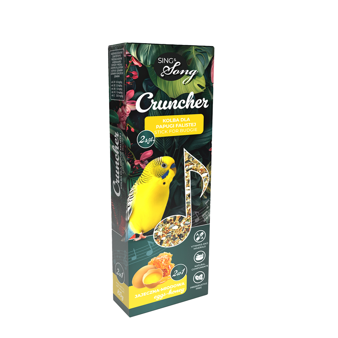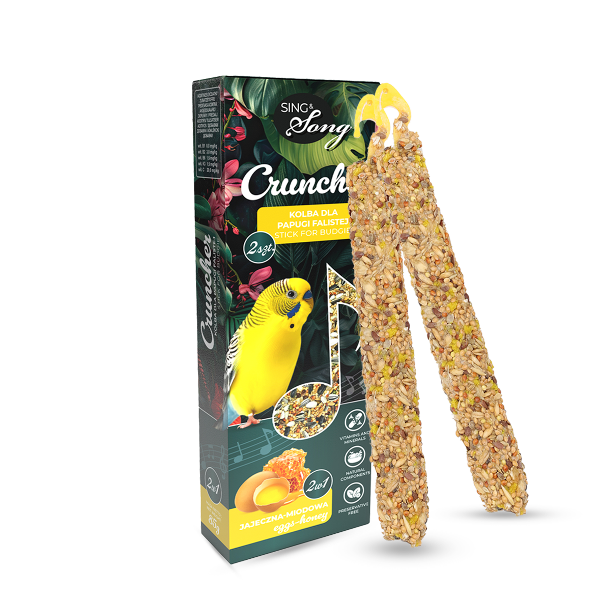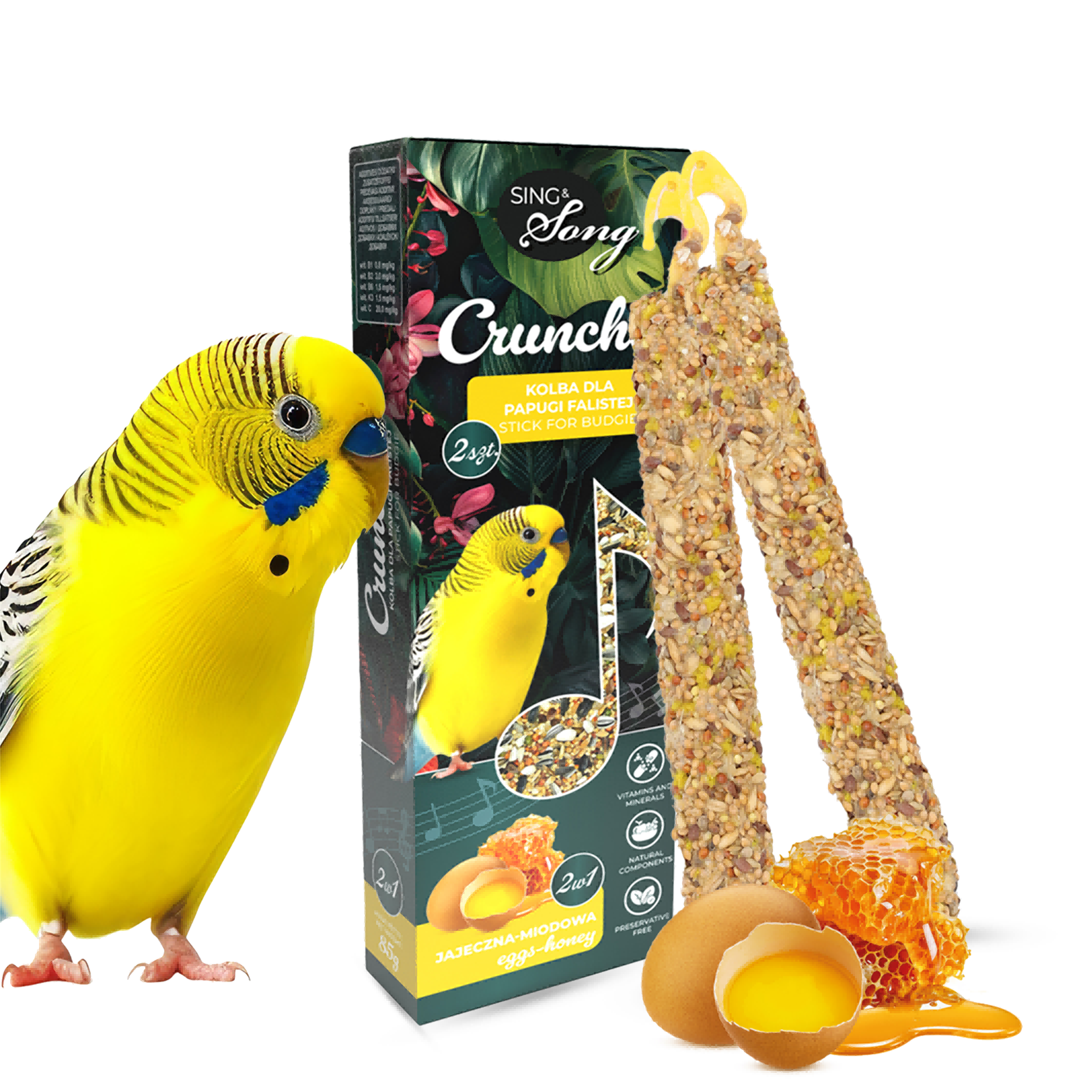 Te smakowite przekąski łączą wszystko, czego twoja papużka potrzebuje, aby cieszyć się świetną zabawą i jednocześnie dbać o pielęgnację dzioba i pazurków. Zawierają wartościowe składniki odżywcze, które wspierają zdrowie twojego pupila. Jajko stanowi doskonałe źródło egzogennych aminokwasów, niezbędnych do budowy i regeneracji tkanek. Proso, płatki owsiane i konopie dostarczają niezbędnych węglowodanów i tłuszczów, a miód, będący naturalnym słodzikiem, zachęci nawet największego niejadka. Dodatkowo miód posiada właściwości antyseptyczne i przeciwbakteryjne, co wspiera zdrowie papużki.