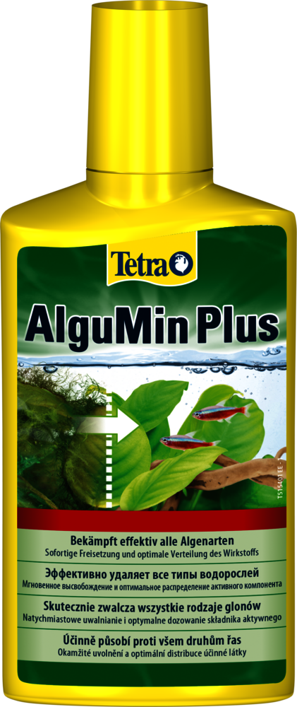 Tetra AlguMin Plus to optymalny środek do zwalczania wszystkich rodzajów glonów. Dzięki płynnej formule, wysoce skoncentrowana substancja czynna jest natychmiast uwalniana i optymalnie rozprowadzana w wodzie. Optymalna ochrona przed glonami: glony szpecą akwarium oraz mogą hamować wzrost roślinności i zaburzać równowagę biologiczną w akwarium w perspektywie długofalowej. Tetra AlguMin Plus. Środki glonobójcze należy stosować z zachowaniem środków ostrożności. Przed każdym użyciem należy przeczytać etykietę i informacje dotyczące produktu. Tetra AlguMin Plus skutecznie zwalcza wszystkie rodzaje glonów i jest łagodny dla wszystkich mieszkańców akwarium, roślin i mikroorganizmów, jeśli jest stosowany zgodnie z zaleceniami. Płynna formuła pozwala poradzić sobie z glonami, gdyż wysokie stężenie substancji aktywnej atakuje metabolizm glonów i skutecznie zapobiega ich rozwojowi poprzez natychmiastowe jej uwalnianie do wody w akwarium, Tetra AlguMin Plus szybko zwalcza glony. Produkt nie odbarwia wody w akwarium. Tetra AlguMin Plus jest odpowiedni do wszystkich akwariów słodkowodnych. Podczas stosowania produktu akwarium należy napowietrzać, na przykład stosując pompkę do akwarium, w celu zapewnienia właściwej ilości tlenu. Martwe glony należy usuwać mechanicznie, przy użyciu siatki, by nie miały negatywnego wpływu na jakość wody.