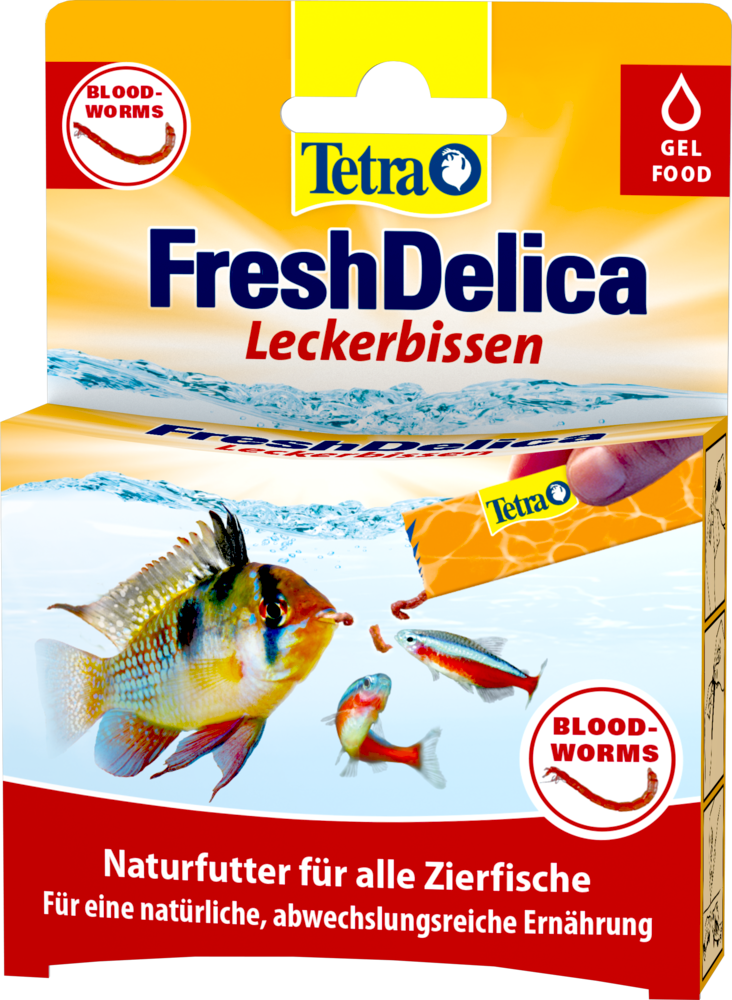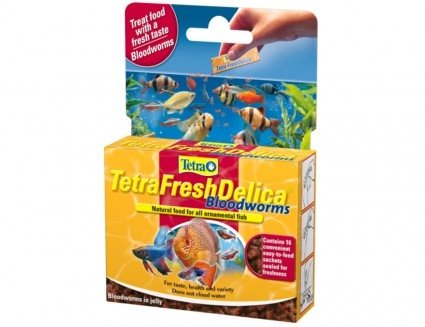 Tetra FreshDelica Bloodworms to pokarm żelowy zawierający w swoim składzie 30% ochotki przeznaczony jako pokarm uzupełniający dietę dla ryb ozdobnych.