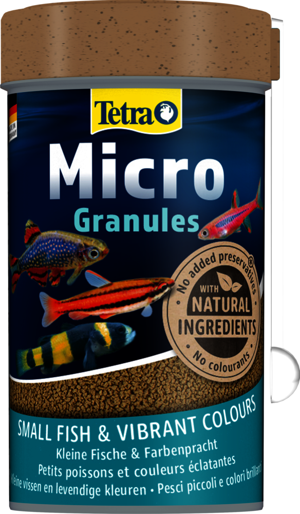 Tetra Micro Granules to karma podstawowa dla wszystkich ryb ozdobnych o małym pyszczku. Granulki mają szczególnie małą średnicę 0,3–1 mm, zawierają wysokiej jakości składniki odżywcze i wyróżniają się zbilansowaną kompozycją składników roślinnych i zwierzęcych. Czerwony pokarm zawiera karotenoidy zapewniające intensywny kolor, z kolei zielony pokarm ze składnikami ziołowymi przyczynia się do poprawy zdrowia i witalności. Małe granulki Tetra Micro Granules są idealne dla małych ryb, ponieważ szybko miękną w wodzie, dzięki czemu są łatwe do jedzenia. Podsumowując, Tetra Micro Granules to idealna karma podstawowa dla wszystkich małych ryb ozdobnych, a także młodych, rosnących pielęgnic i ryb morskich.
