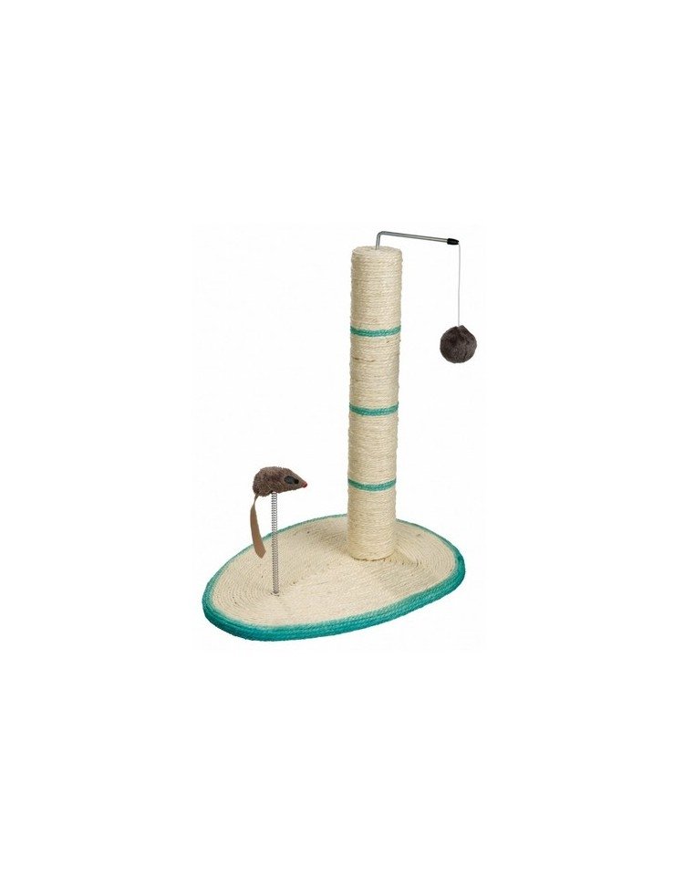 Drapak z piłką i myszką pięknie się prezentuje i nie zajmuje zbyt dużo miejsca. Spełni oczekiwania kota, ponieważ wyposażony jest w sizalowy słupek do drapania oraz wykonaną z takiego samego materiału podstawę. Do niej przymocowana jest miękka pluszowa myszka na sprężynie, którą kot będzie mógł się pobawić jeśli będzie miał na to ochotę. Sprężyna utrzymuje myszkę na miejscu, nie ma więc ryzyka jej zgubienia. Do szczytu słupka przytwierdzony został sznurek, na końcu którego znajduje się pluszowa piłka, która również posłuży czworonogowi do zabawy.