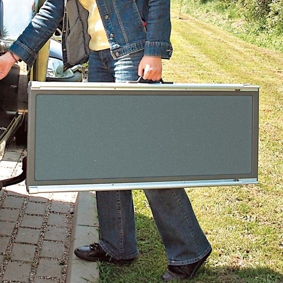 Powierzchnia wejścia wyłożona jest przeciwpoślizgową matą z niezmywalnego papieru piaskowego, a obustronnie podwyższone szyny mocne i stabilne poruszanie się po tej rampie. Materiał jest przystępny do utrzymania w czystości. Rampa teleskopowa jest łatwa do transportu. Można ją wykorzystać przy wejściu do auta, do łóżka, po schodach.