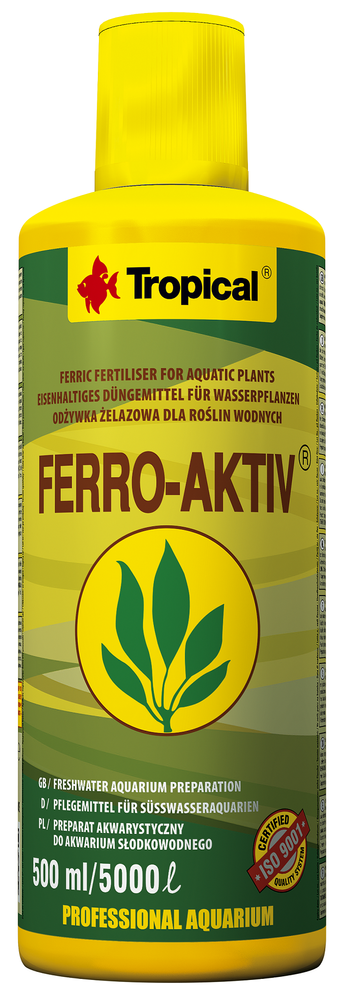Przeznaczona do systematycznego uzupełniania żelaza w wodzie – pierwiastka, który wchodzi w skład chlorofilu (barwnika fotosyntetycznego roślin). Niedobory żelaza objawiają się chlorozą, liście stają się blade, na skutek zahamowania syntezy chlorofilu, pociąga to za sobą zaburzenia we wzroście roślin. Zalecamy używanie odżywki Ferro-Aktiv przynajmniej raz w tygodniu podczas podmiany wody w akwarium. Przy gęstej obsadzie roślin można stosować mniejsze dawki w krótszych okresach czasu. Stosowany regularnie Ferro-Aktiv zapewnia żywą, intensywną zieleń roślin wodnych oraz ich bujny wzrost.