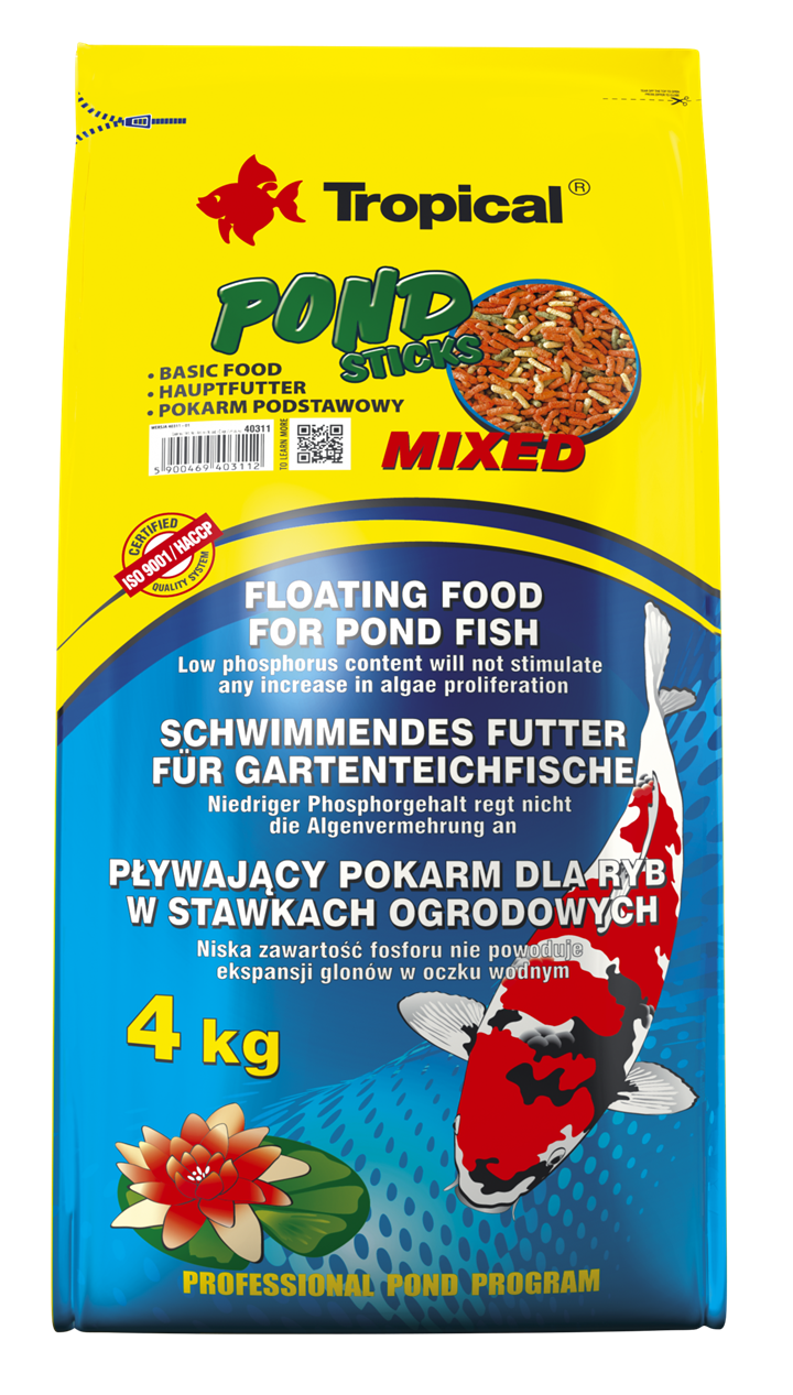 Pond Sticks Mixed to wieloskładnikowy pokarm w formie pływających pałeczek dla karpi koi, złotych rybek oraz innych ozdobnych ryb karpiowatych hodowanych w stawach ogrodowych i sadzawkach. Odpowiednio zbilansowana receptura, zawierająca składniki odżywcze pochodzenia roślinnego i zwierzęcego oraz zestaw witamin i mikroelementów, zapewnia rybom doskonałą kondycję i zdrowie. Pokarm w pełni zaspokaja potrzeby żywieniowe ryb, wzmacniając jednocześnie ich czerwone i złote wybarwienie. Pond Sticks Mixed zjadany jest chętnie również przez niektóre płazy i raki zamieszkujące oczko wodne. Ryby regularnie karmione pokarmem Pond Sticks Mixed są zdrowe, pełne życia i pięknie wybarwione.
