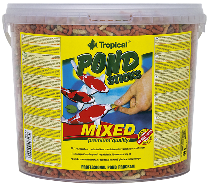 Pond Sticks Mixed to wieloskładnikowy pokarm w formie pływających pałeczek dla karpi koi, złotych rybek oraz innych ozdobnych ryb karpiowatych hodowanych w stawach ogrodowych i sadzawkach. Odpowiednio zbilansowana receptura, zawierająca składniki odżywcze pochodzenia roślinnego i zwierzęcego oraz zestaw witamin i mikroelementów, zapewnia rybom doskonałą kondycję i zdrowie. Pokarm w pełni zaspokaja potrzeby żywieniowe ryb, wzmacniając jednocześnie ich czerwone i złote wybarwienie. Pond Sticks Mixed zjadany jest chętnie również przez niektóre płazy i raki zamieszkujące oczko wodne. Ryby regularnie karmione pokarmem Pond Sticks Mixed są zdrowe, pełne życia i pięknie wybarwione.