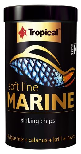 MARINE (S, M i L) to miękki pokarm w formie tonącego granulatu (rozmiar S) lub tonących chipsów (rozmiary M i L) dla wszystkożernych ryb morskich. W jego skład wchodzą śledzie i larwy owadów, które dostarczają wysokiej jakości białka oraz kwasów tłuszczowych omega-3, omega-6 i omega-9. Zawiera skorupiaki i mięczaki (kryl 10,5%, kalmary 6%, kalanus 1,7%) oraz glony (Spirulina platensis 12%, Ascophyllum nodosum 3%, Laminaria digitata 1,8%, Chlorella vulgaris 8%), które są źródłem m.in.: białka, karotenoidów, związków mineralnych i prebiotyków. Wzmacnia odporność ryb, a także intensyfikuje barwy ryb dzięki wysokiej zawartości karotenoidów z kryla, kalanusa i czerwonej papryki.