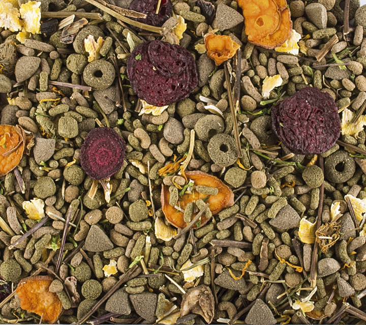 • Produkty pochodzenia roślinnego (w tym granulat z trawami 9%, granulat z lucerną 6%, nać pietruszki, mięta, rumianek, kwiat nagietka)