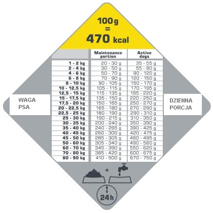 Wspiera układ odpornościowy, zapewnia giętkość stawów i zdrowe chrząstki. Zawiera L-kartyninę, co pomaga kontrolować wagę psa.