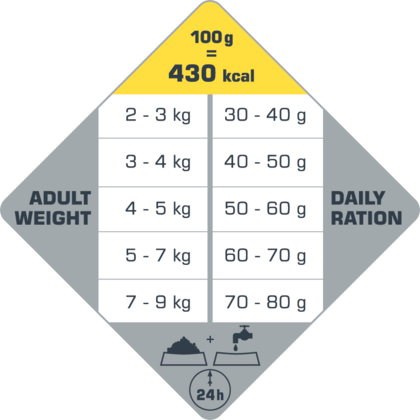 Skład: kurczak (50% suszone), ziemniaki, tłuszcze zwierzęce, groch, błonnik roślinny (celuloza 2,5%, wysłodki buraczane 1%), hydrolizowane białka zwierzęce, łosoś, olej z łososia, drożdże piwne, minerały, suszone całe jaja, FOS (0,3%) MOS (0,1%), algi morskie (Ascophyllum nodosum), juka (250 mg/kg), rozmaryn (14 mg/kg), zielona herbata (10 mg/kg)