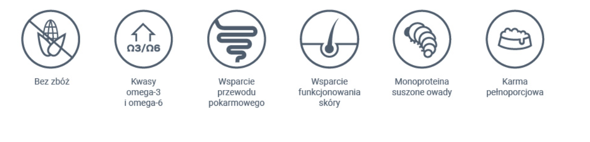 Dieta Hypoallergenic Insect zawiera białko z larw owada Hermetia illucens jako jedyne źródło białka pochodzenia zwierzęcego, co minimalizuje ryzyko alergii na białko zwierzęce.