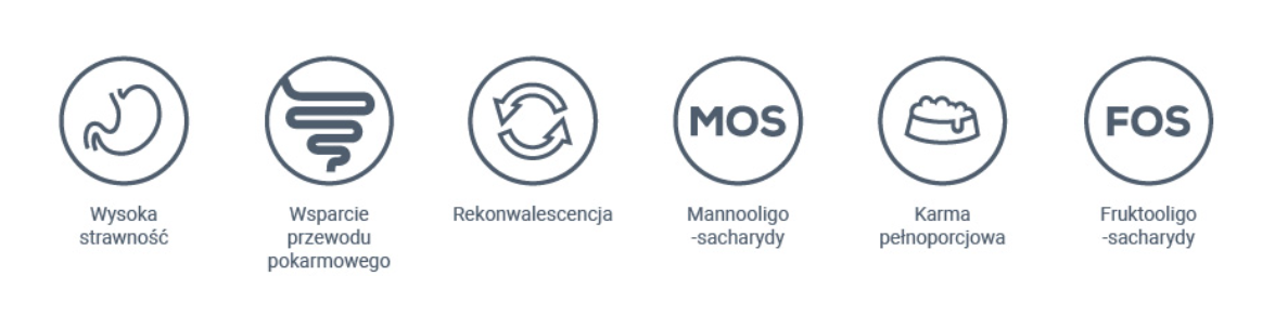 Karma spełnia zapotrzebowanie pokarmowe szczeniąt i psów dorosłych. Przed podaniem lub przedłużeniem okresu podawania karmy należy skonsultować się z lekarzem weterynarii. Szczególnie dla psów mających: zaburzenia funkcji przewodu pokarmowego: zapalenie żołądka, jelita cienkiego i jelita grubego, przebiegające z biegunką, złe trawienie i wchłanianie, rekonwalescencję, zewnątrzwydzielniczą niewydolność trzustki, przewlekłe zapalenie trzustki, stany po ostrym zapaleniu trzustki. Wysoka strawność – zwiększa ilość składników pokarmowych wykorzystywanych przez organizm zwierzęcia. Obniżona ilość włókna surowego – poprawia strawność podawanego pokarmu i zmniejsza ilość oddawanego kału. Obniżona ilość tłuszczu – hamuje stymulację trzustki u zwierząt z zewnątrzwydzielniczą niewydolnością trzustki. Dodatek rozpuszczalnych węglowodanów (inulina) – jako źródło fruktooligosacharydów wykorzystywanych przez bakterie przewodu pokarmowego, zapewniają to stabilizację mikroflory jelitowej i dostarcza energii dla komórek jelita grubego. Zwiększona zawartość elektrolitów – pozwala na wyrównanie strat spowodowanych wymiotami lub biegunką. Dodatek imbiru – pobudza perystaltykę przewodu pokarmowego, działa osłaniająco i przeciwzapalnie w przewodzie pokarmowym. Wielokierunkowe działanie – wspomaga funkcjonowanie stawów.