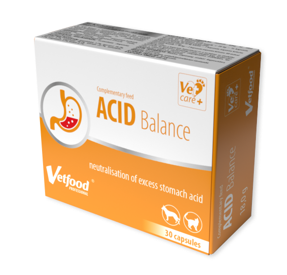 Suplement dla zwierząt domowych(kotów, psów) z zaburzeniami trawienia. ACID Balance to produkt zawierający w składzie dwa naturalne związki zobojętniające kwas solny: węglan wapnia i węglan magnezu. Są to sole o charakterze zasadowym, które wchodząc w reakcję z HCl powodują jego  przemianę w wodę i sole mineralne.