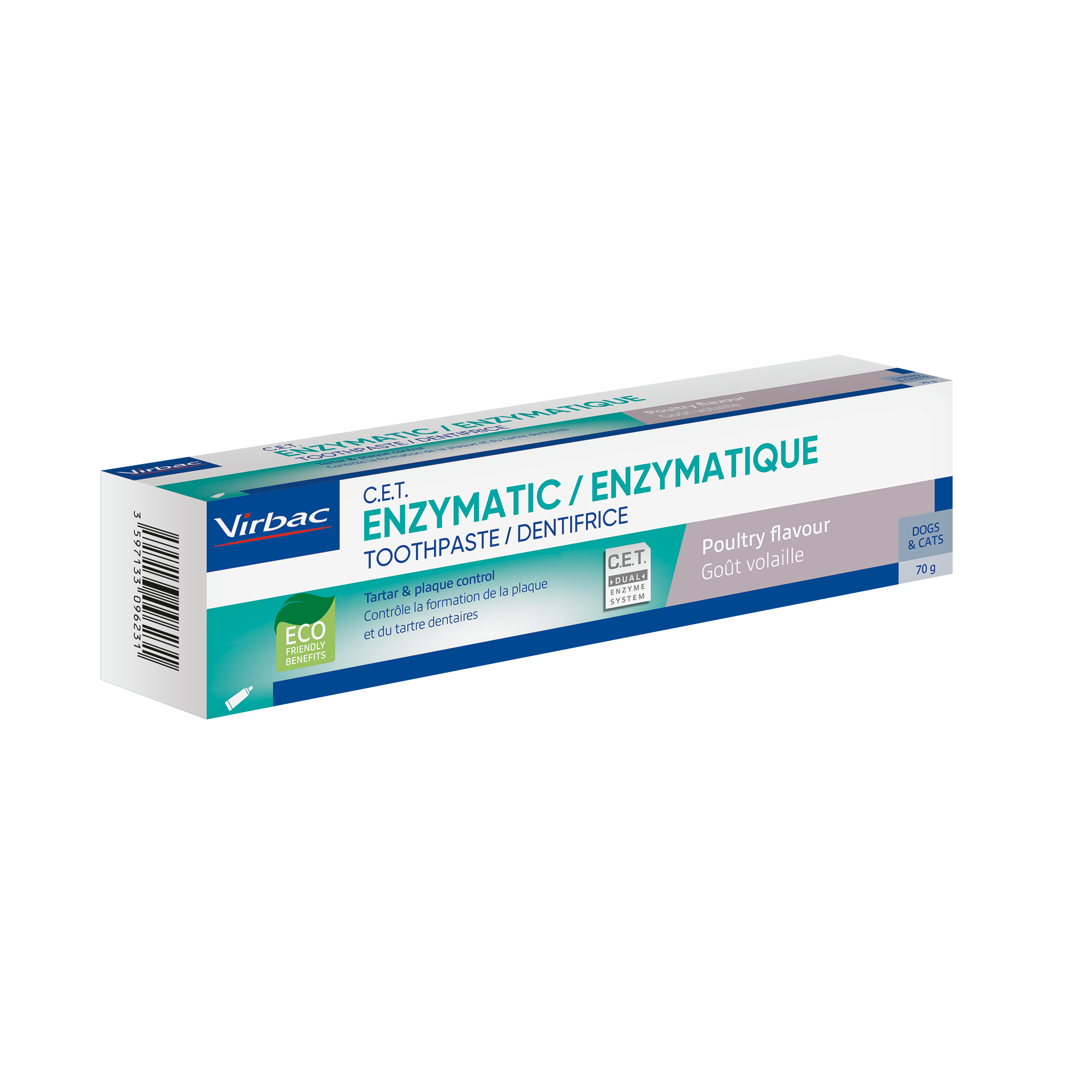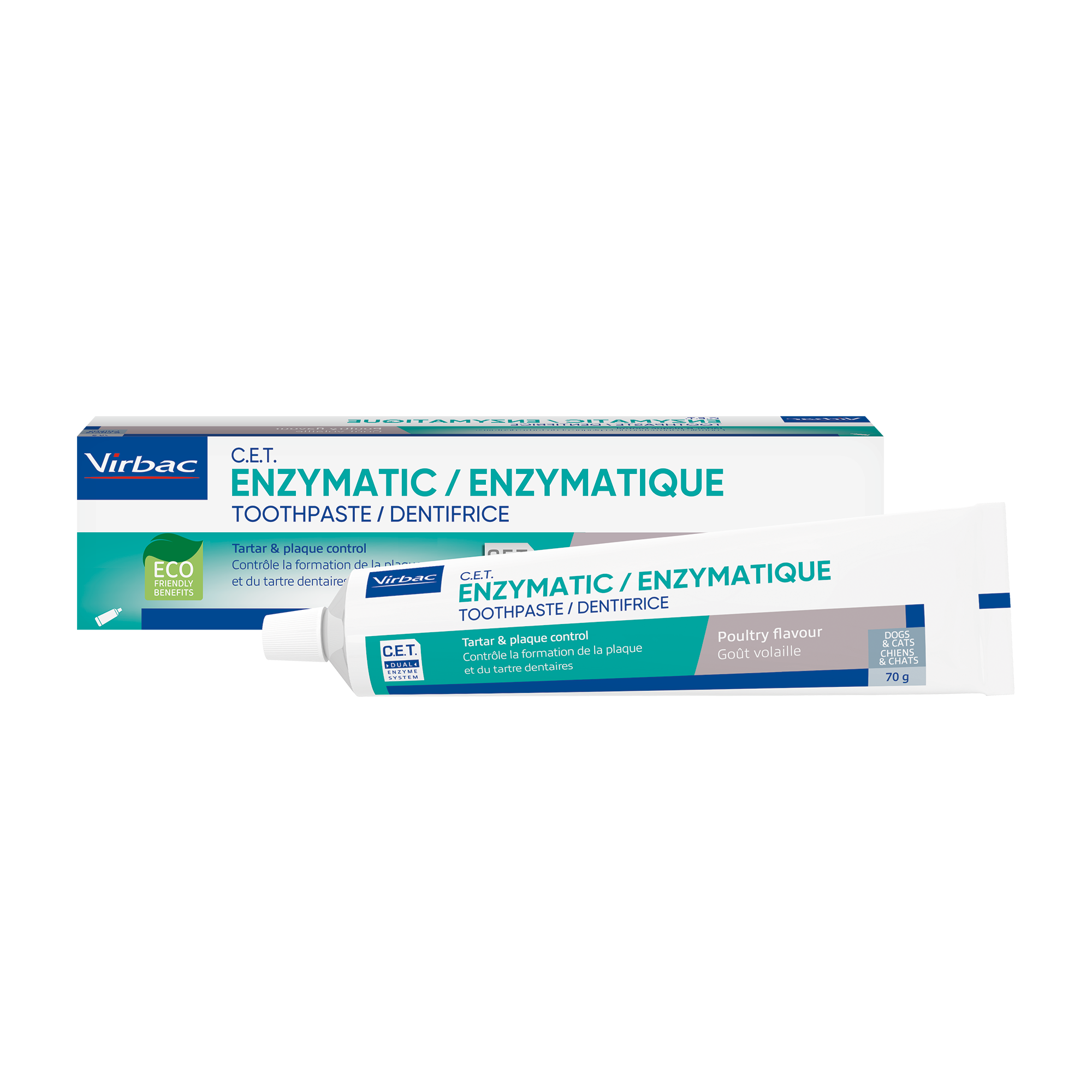 Enzymatyczna pasta do zębów firmy Virbac jest smaczną pastą stworzoną z myślą o psach i kotach, zawierającą opatentowany kompleks C.E.T. (Complex Enzymatic Thiocyanate) w skład którego wchodzą 2 enzymy (oksydaza glukozowa, laktoperoksydaza) i tiocyjanian potasu. Kompleks ten wzmacnia naturalne mechanizmy obronne jamy ustnej. Aromat drobiowy sprawia, że psy i koty dobrze tolerują smak pasty. Nie jest wymagane płukanie jamy ustnej po jej zastosowaniu.
