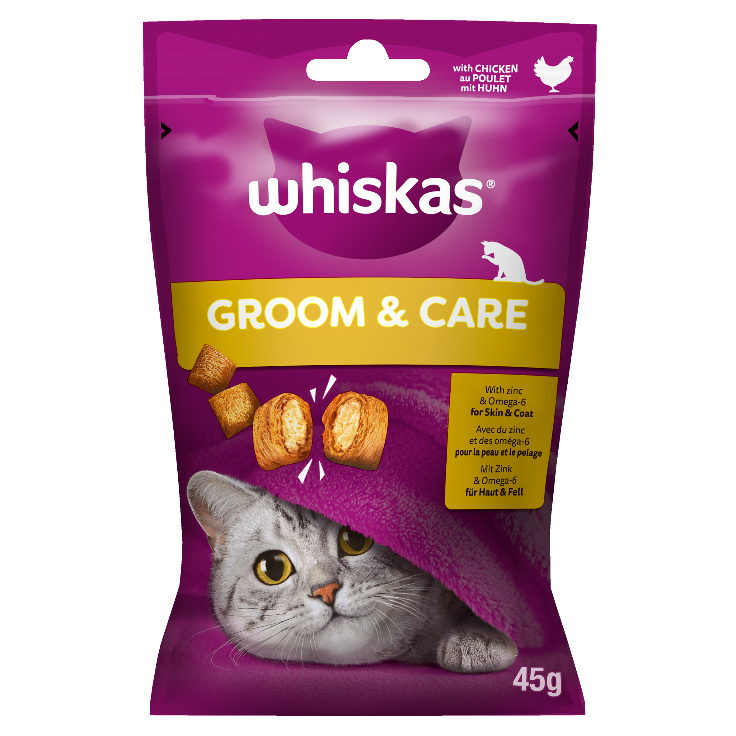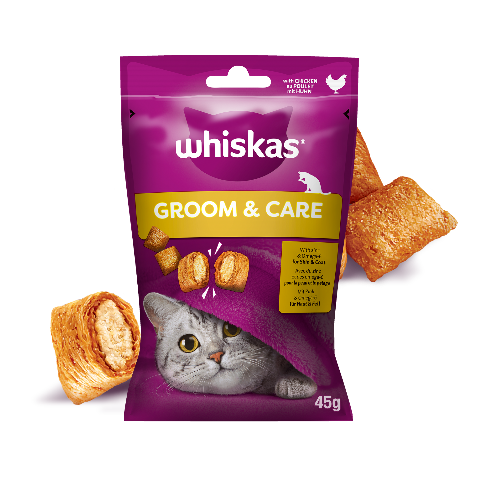 WHISKAS® Zdrowy Blask z kurczakiem to przekąska w formie pasztecików z kremowym nadzieniem, wzbogacona o minerały i zieloną herbatę będącą naturalnym źródłem przeciwutleniaczy. Zawiera cynk i kwasy Omega-6, które wspierają zdrową skórę i sierść.