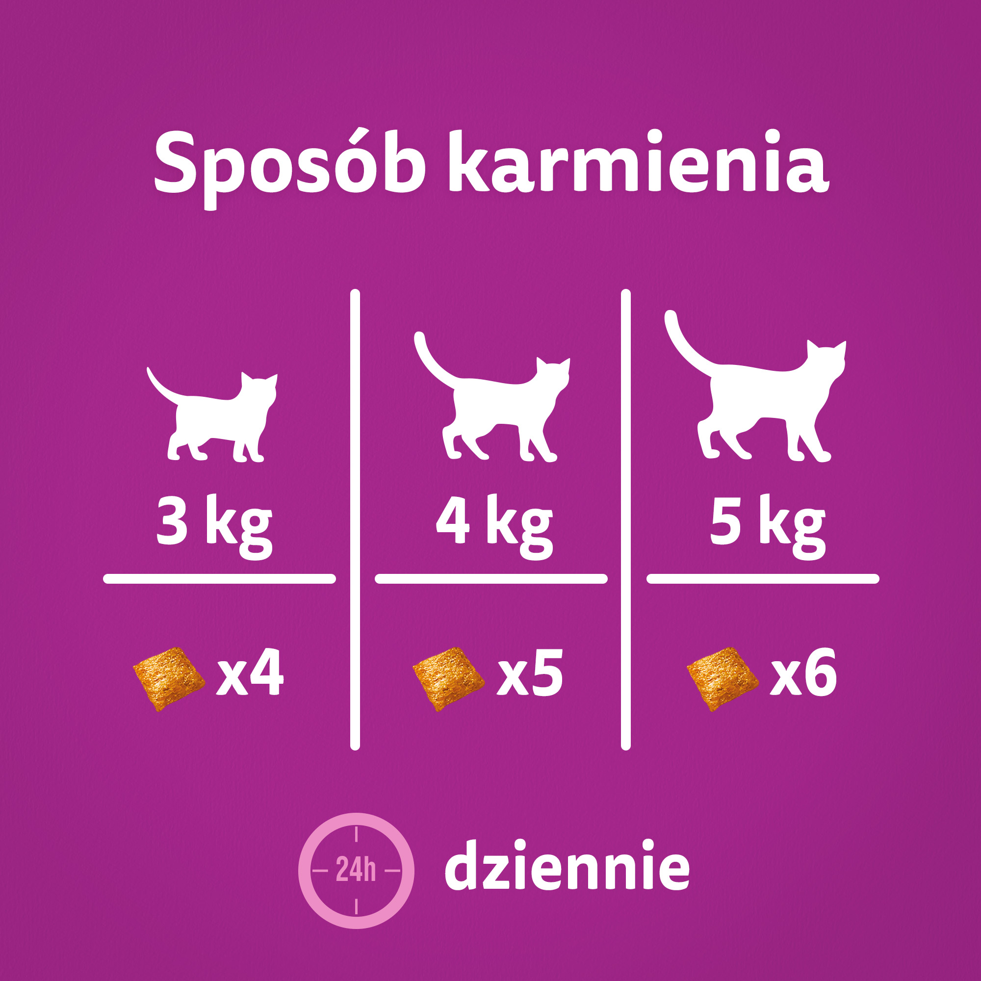Kot o masie 3 kg – do 4 sztuk dziennie, 4 kg – 5 sztuk, 5 kg – 6 sztuk. Przy podawaniu przysmaku należy zmniejszyć porcję głównego posiłku.